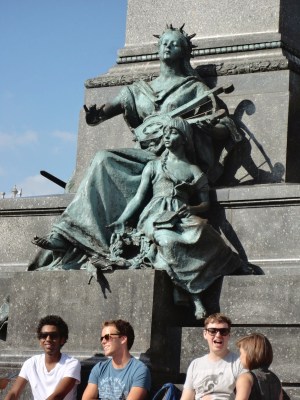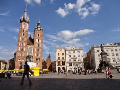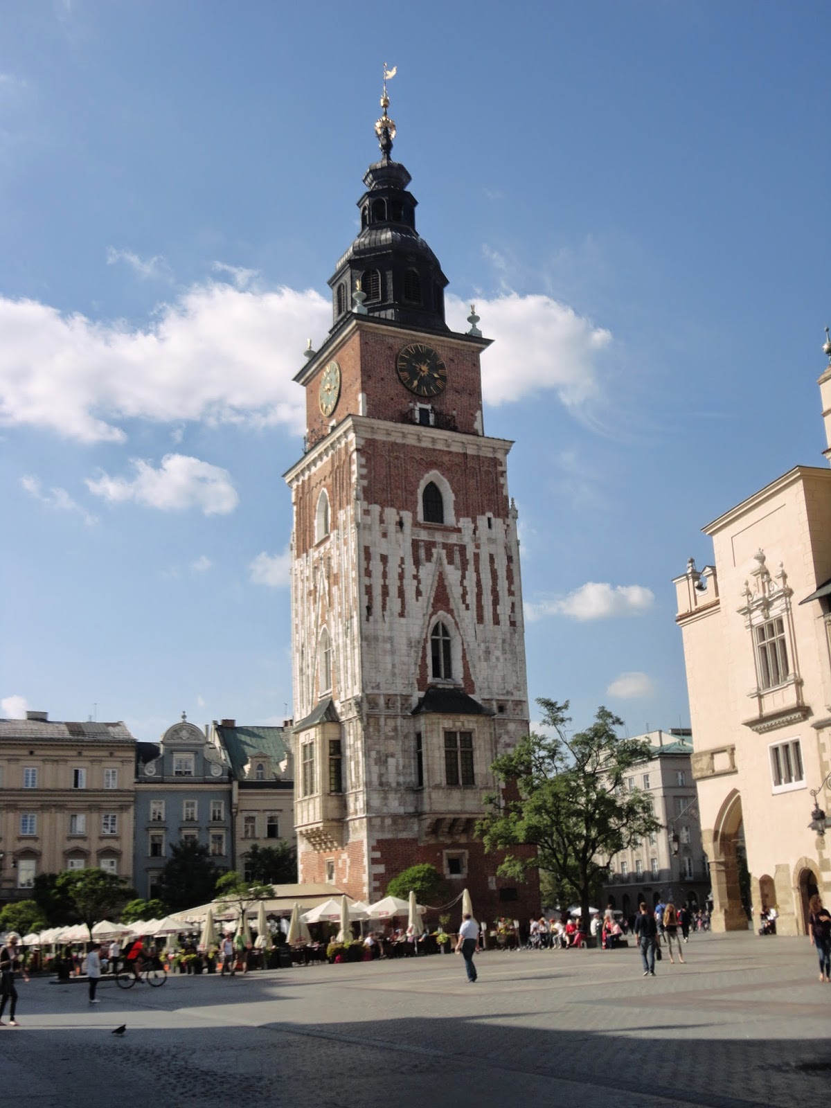 其中的聖母大殿在整點時,塔樓上會響起號角聲,據說是在蒙古大軍入侵時,塔樓上的衛兵發現到敵人馬上吹起了號角通知大家,但隨即就被勇猛的蒙古大軍射死在塔上,進去這個聖母大殿是要額外收費的,於是就坐在廣場的紀念柱下,靜靜的享受陽光,等待整點號角聲的到來。