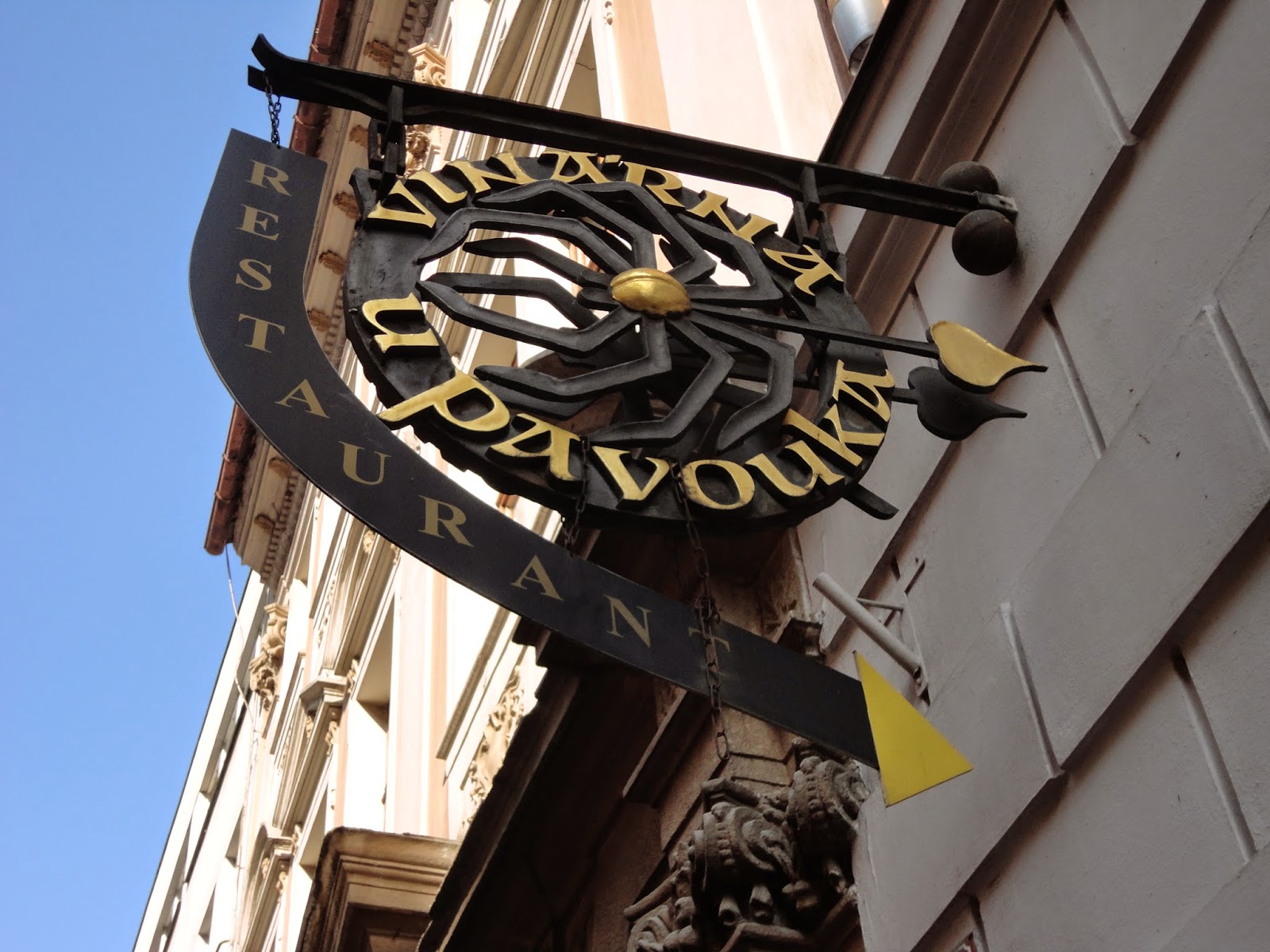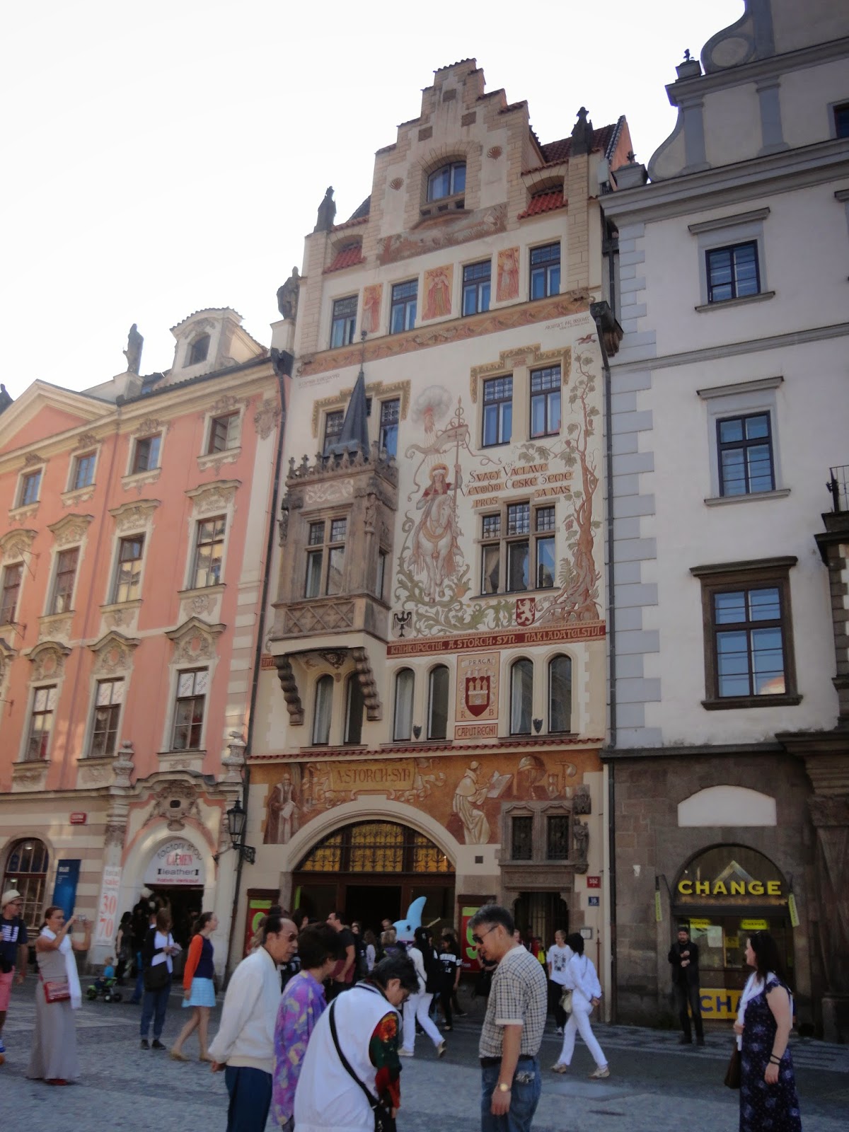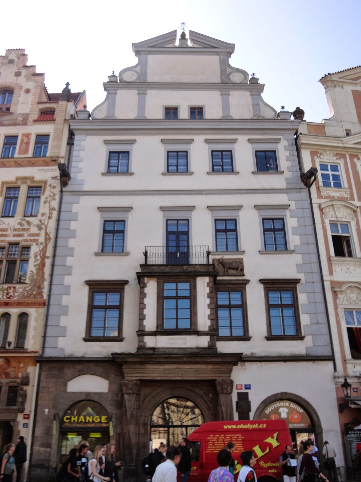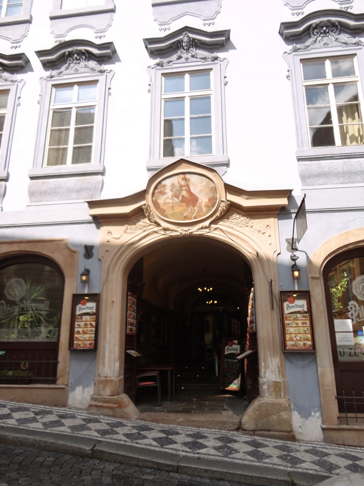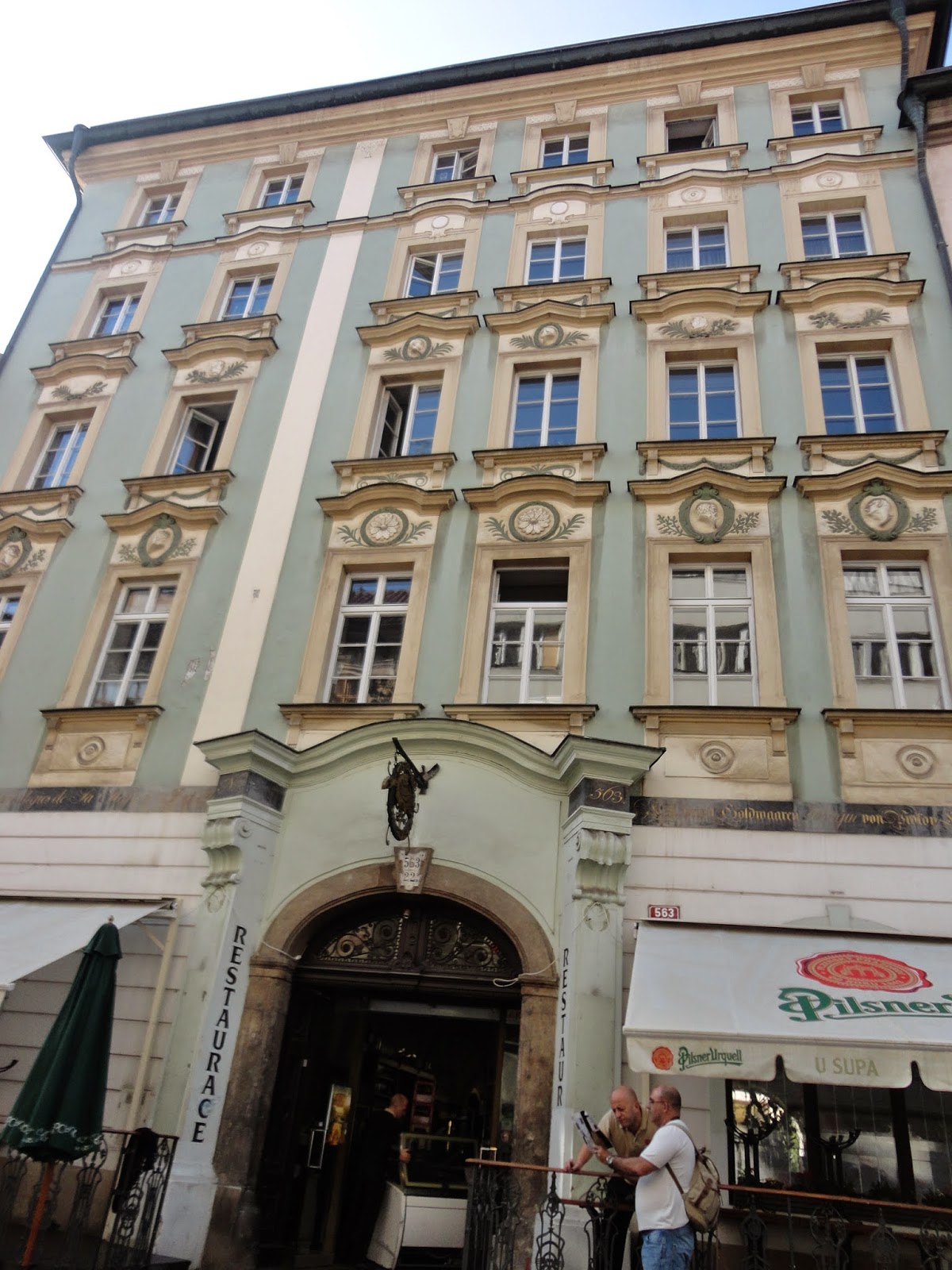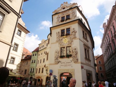 穿過火藥塔,Celetna street街上有許多建築物上的雕刻都非常精緻以及賞心悅目,每棟建築物以及餐廳店門口都會有它獨特的特色,當時拿著一本布拉格百科全書,邊走邊看書學習,現在回憶起來也忘得差不多了,其實不止這條街,許多老建築當初在蓋的時候受到巴洛克式風格的影響,把建築物都蓋得富麗堂皇。