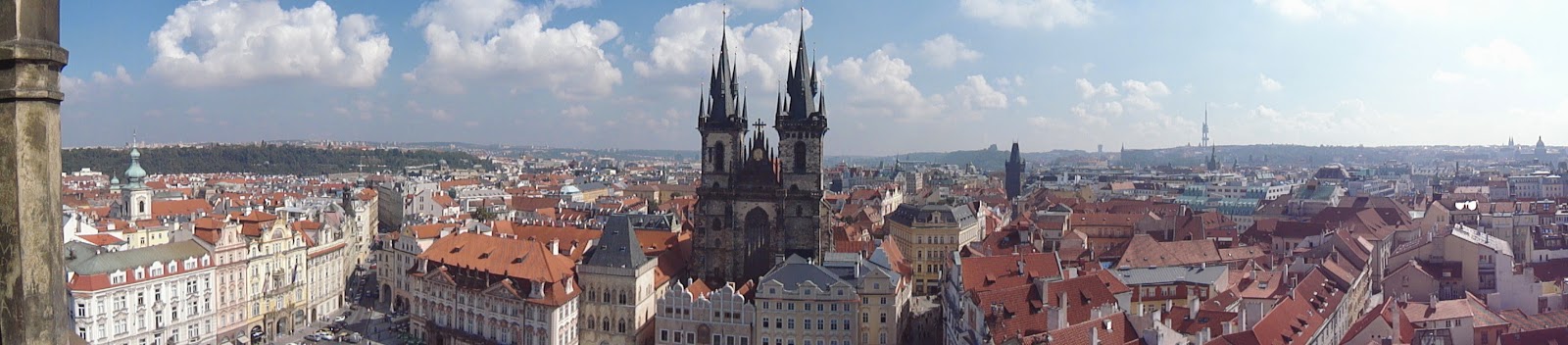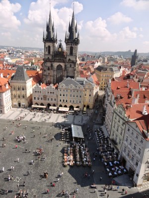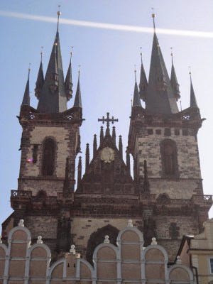 往旁邊看可以看到提恩教堂(Chrám Matky Boží před Týnem)高聳的兩座鐘塔,提恩教堂是胡斯教派所屬的教堂。