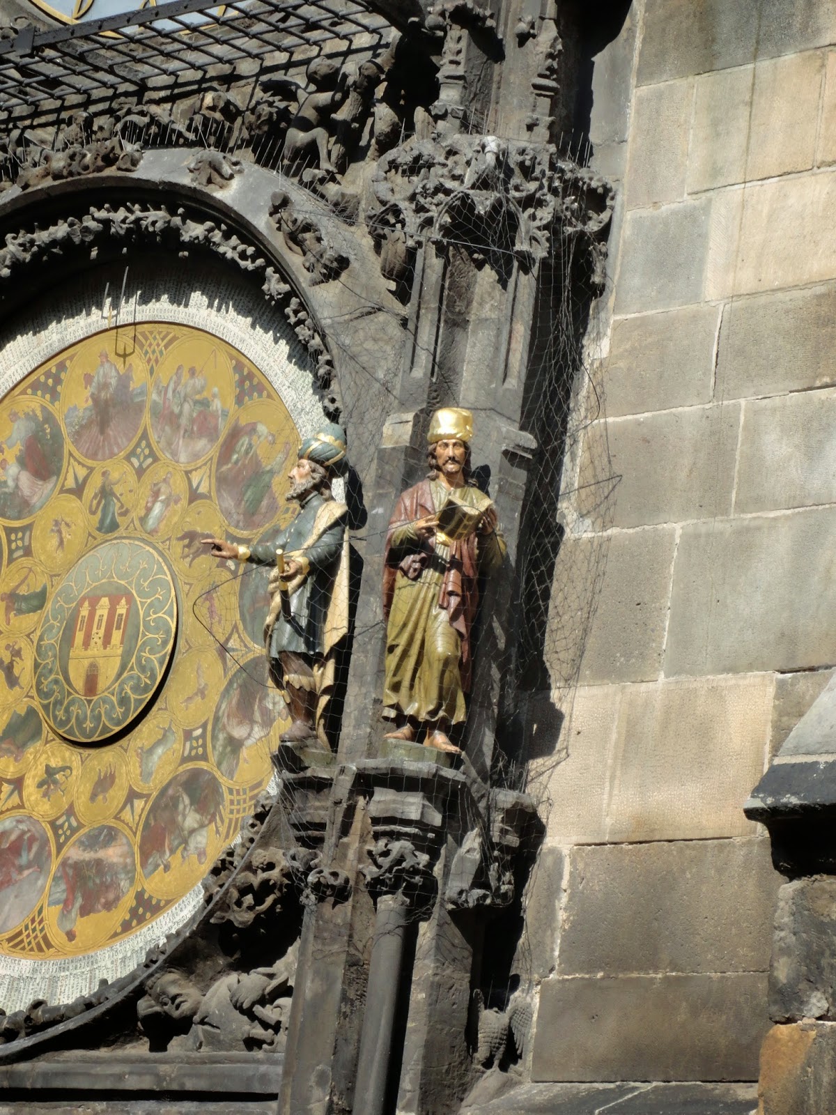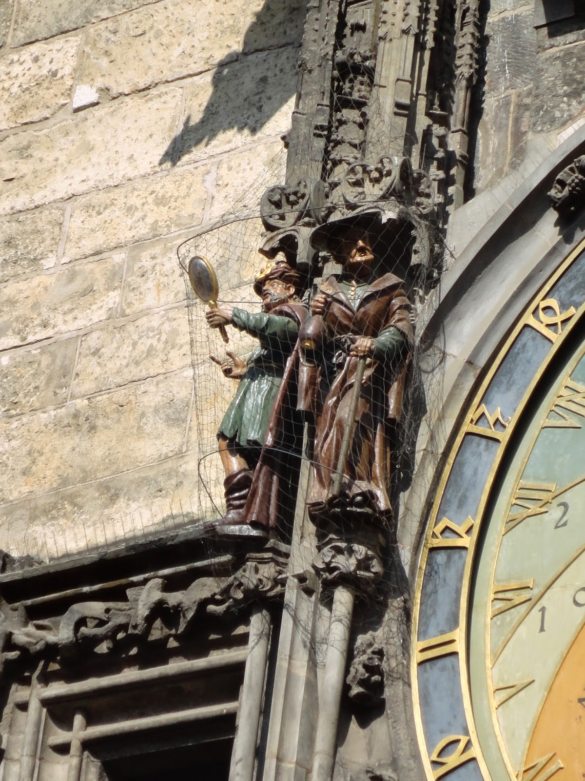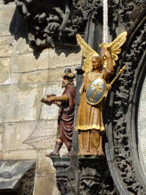 | 天文鐘的右邊第一個雕像是個使徒,它轉動頭部以幾個不同的方向對著鏡子,常見的解釋是代表虛榮並懼怕死亡的心態。第二個雕像是一個行進中的使徒,一手拄著拐杖,另一手貪婪的搖晃著一個錢包,代表貪婪。 |