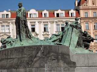 一直往廣場的中央走坐在胡斯的雕像下,