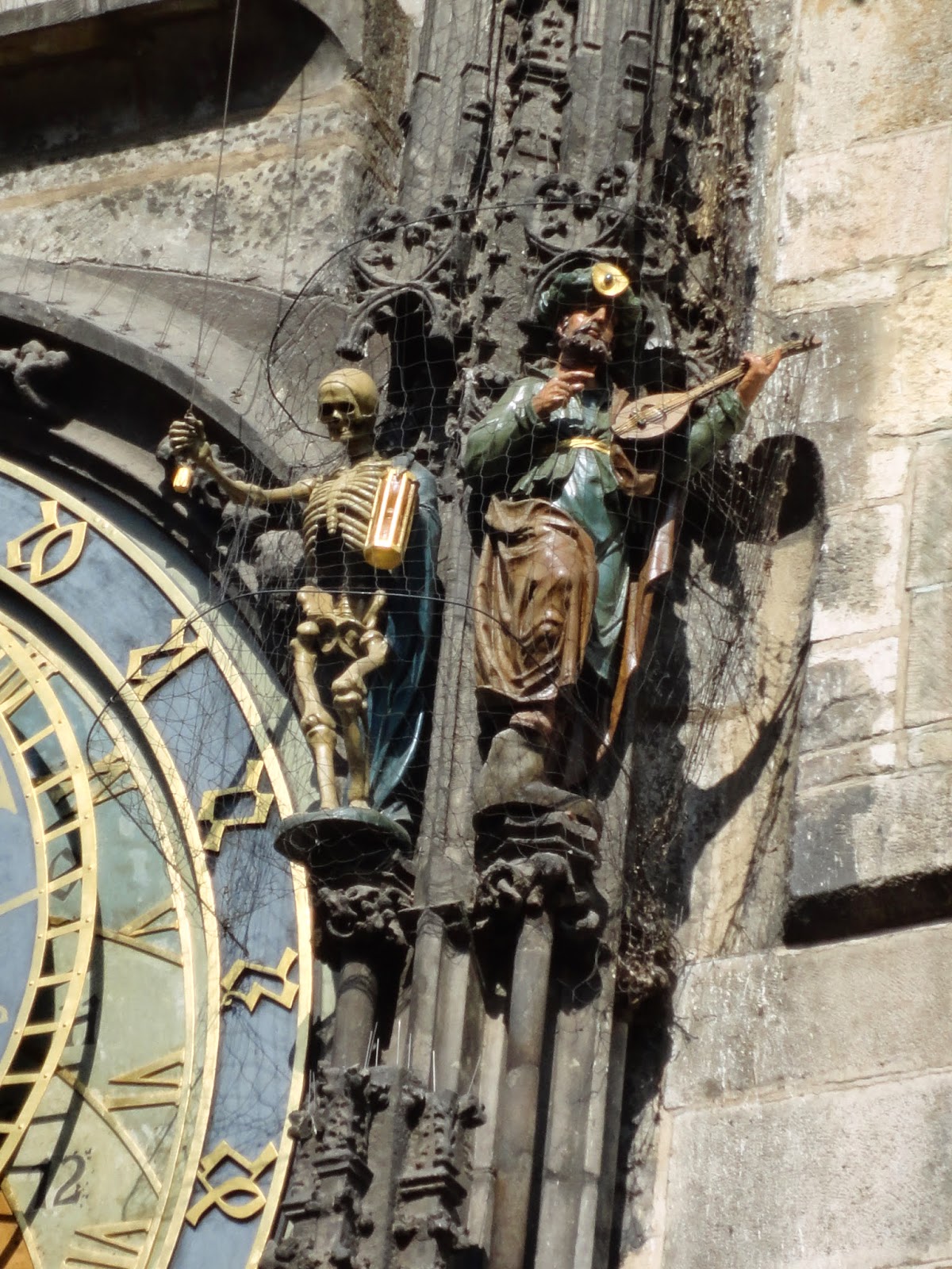 | 天文鐘的左邊雕像,骷顱頭代表死亡的,它一手旋轉著沙漏,另一手拉扯著鈴繩,代表時間是有可能停止的。另一個一般都稱他是突厥人(土耳其的回教徒),最常被認為是快樂的象徵,也常被認為是慾望的象徵。 |