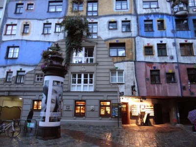 美食之旅結束後,先坐U4到Schwedenplatz,再搭電車1號到Hetzgasse,這是離百水公寓最近的電車站,再往前走幾步就可以看到百水公寓了,此時淋了一整天的雨,鞋子已濕。