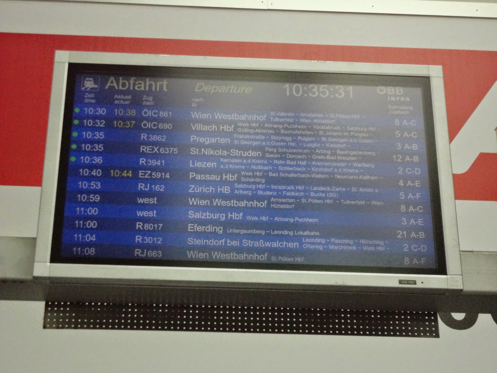 如果是有買歐洲火車跨國通票的當然也還是搭國營火車最省錢,如果沒有事先買火車票,建議大城市與大城市之間可以搭民營的火車Westbahn,有到各大城市,從Linz可以到往東Vienna,往西到Salzburg甚至到德國慕尼黑,票價及火車時刻表網站上都有,這家民營火車是跟國鐵租路線,所以到國營火車站OBB就可以搭乘,直接看火車站看板就可以看到車次和月台,車票直接上車購買,不要跑到國營的櫃台買,可能會被賣票的人白眼喔。