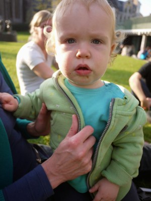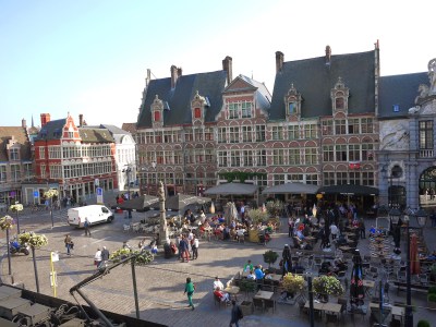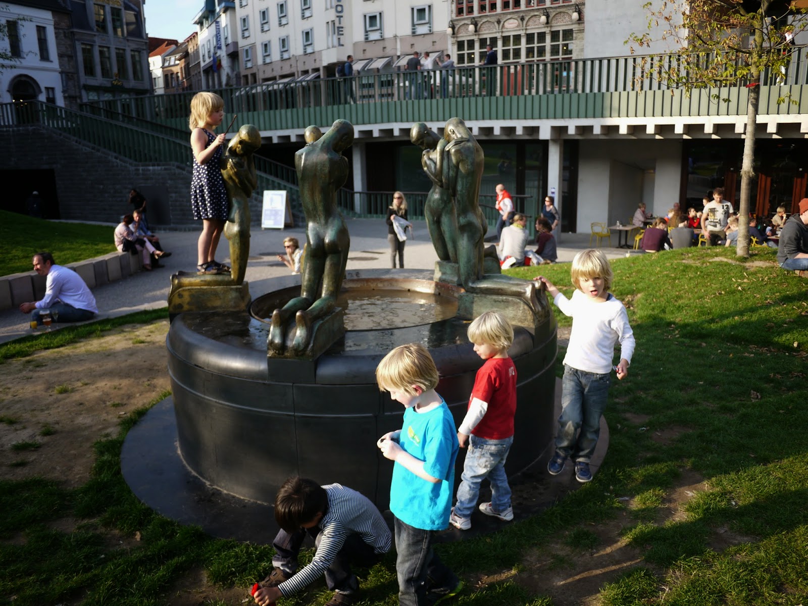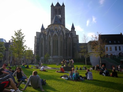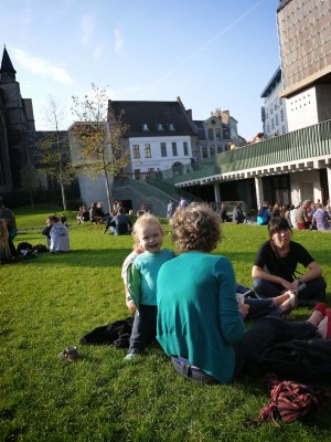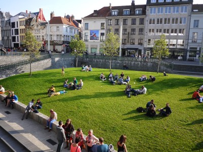 從河邊走回剛剛經過的Emile Braynplein,下面有一大塊草地,許多人都在這裡曬著溫暖的太陽,躺在這裡兩旁是中世紀風格的教堂,而正對面的是現代建築風格的音樂廣場,為這座古老的城市增添不一樣的風貌。