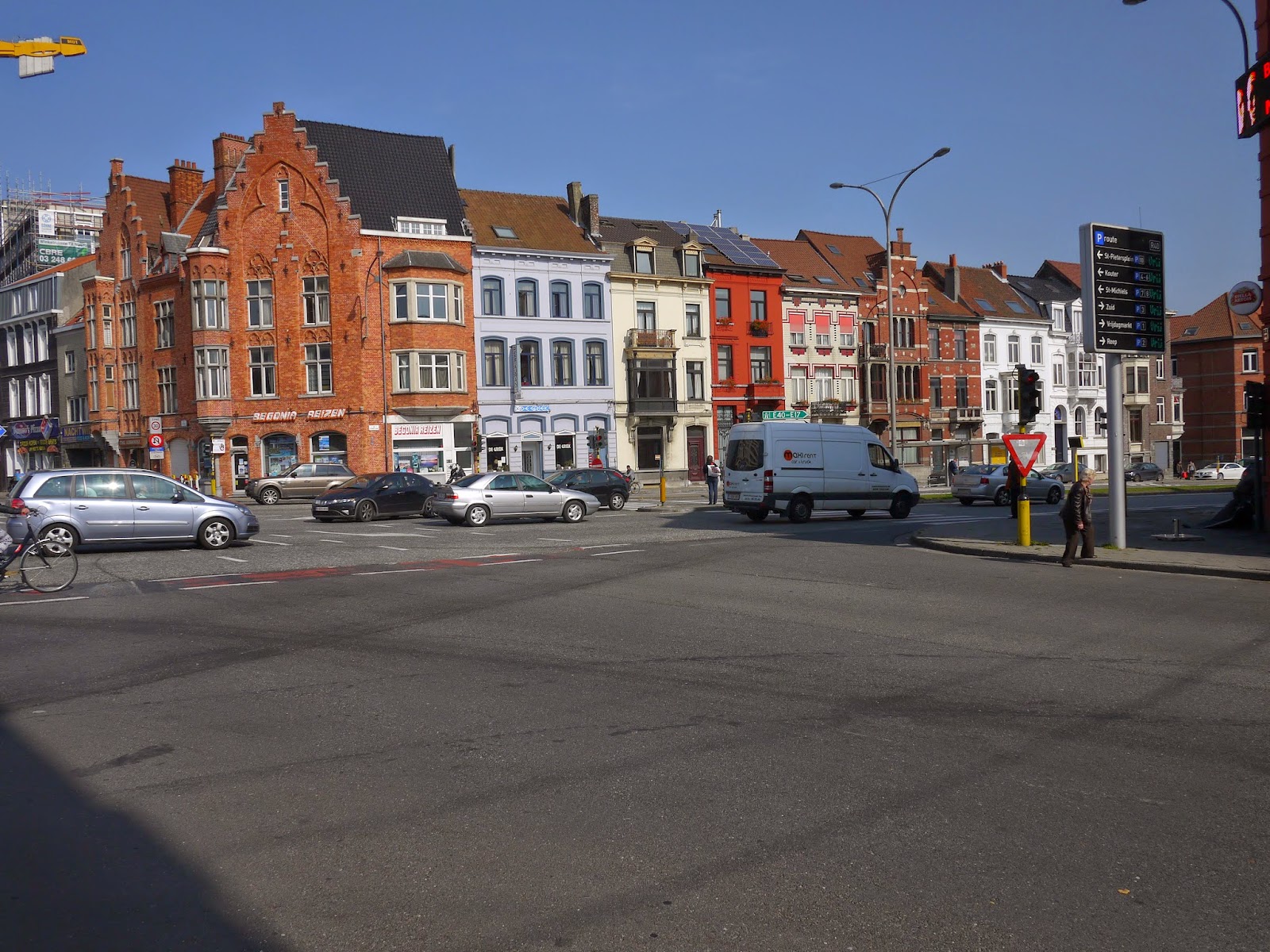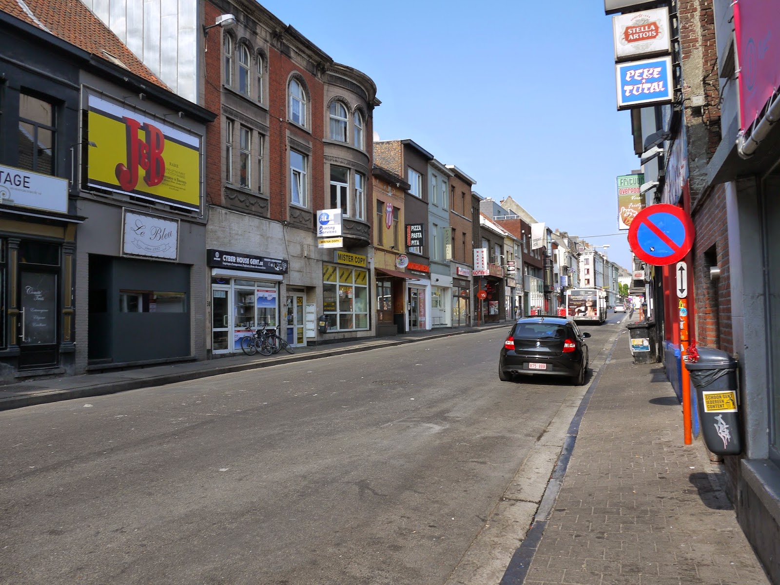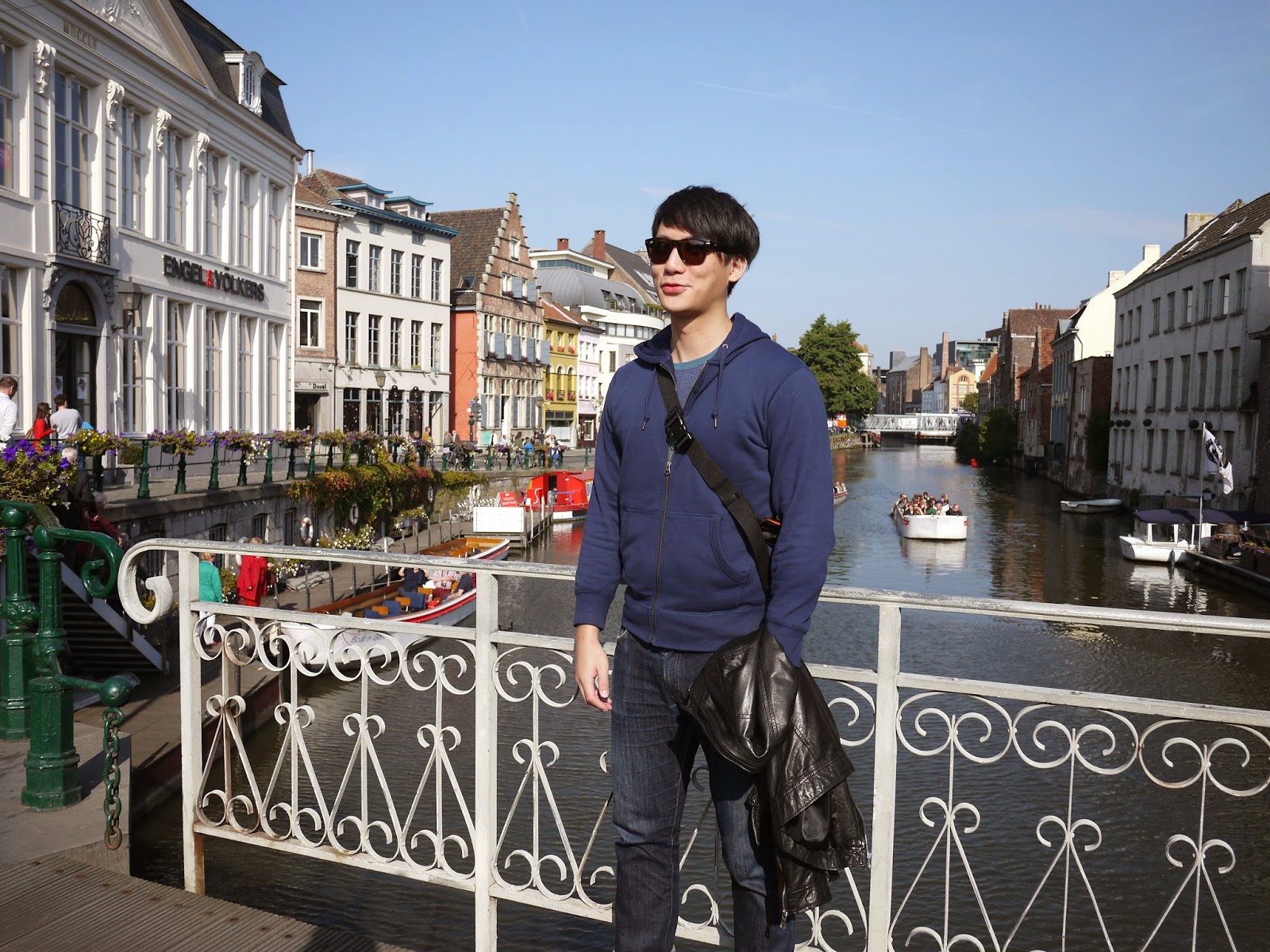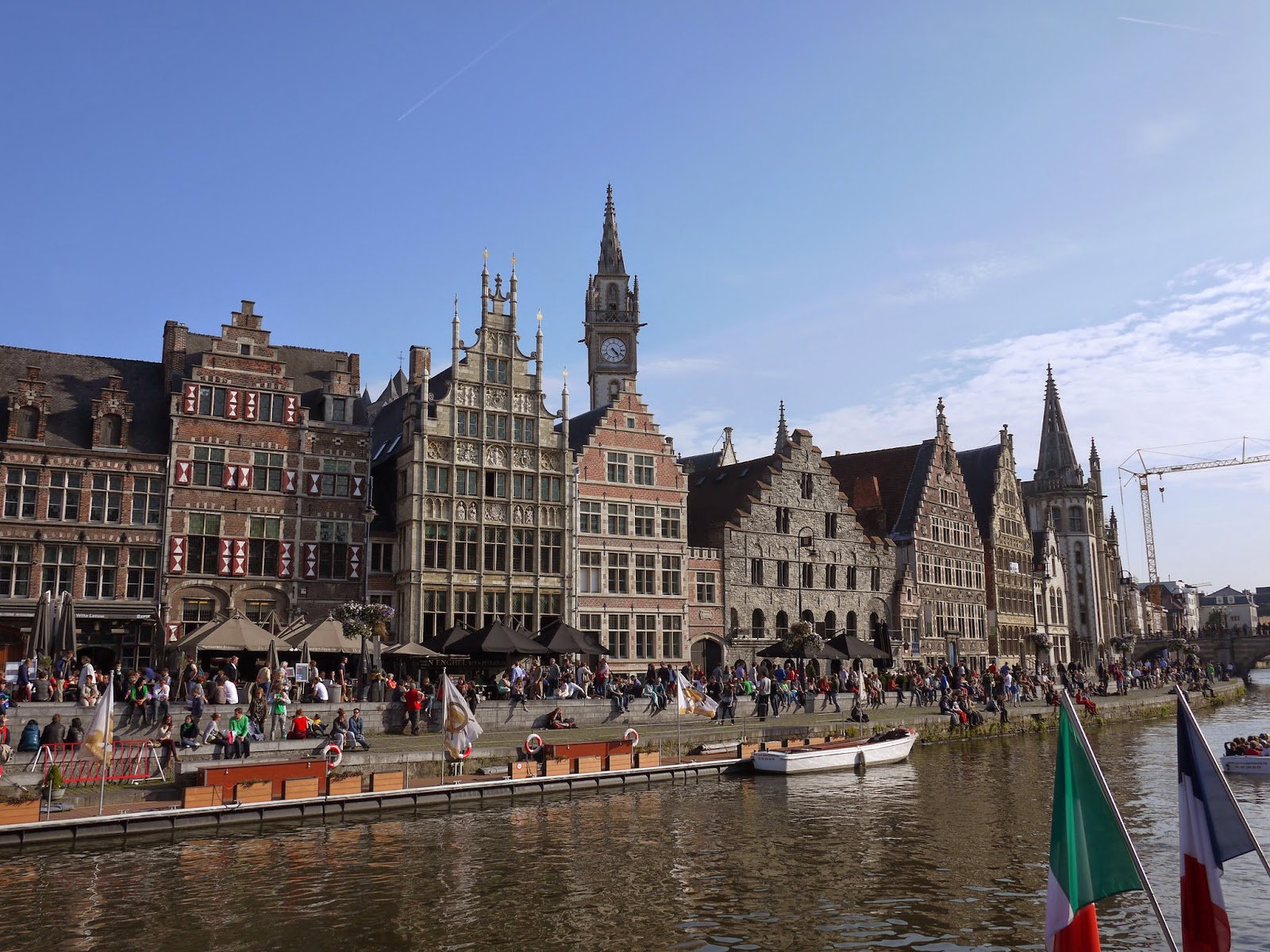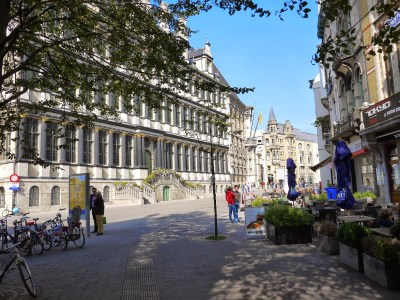 就這樣一行人先到宿舍把東西放好後,沿著Overpoortstraat走也就是根特的夜店街(因為靠近大學宿舍,晚上的酒吧都會變得很熱鬧),一直走經過右邊根特大學的主校區,穿過河到達Gent市中心的徒步區。