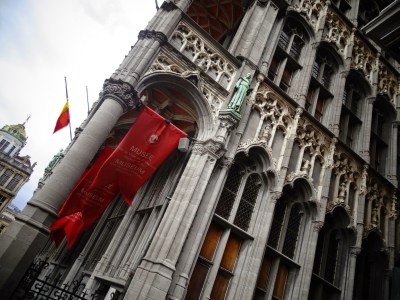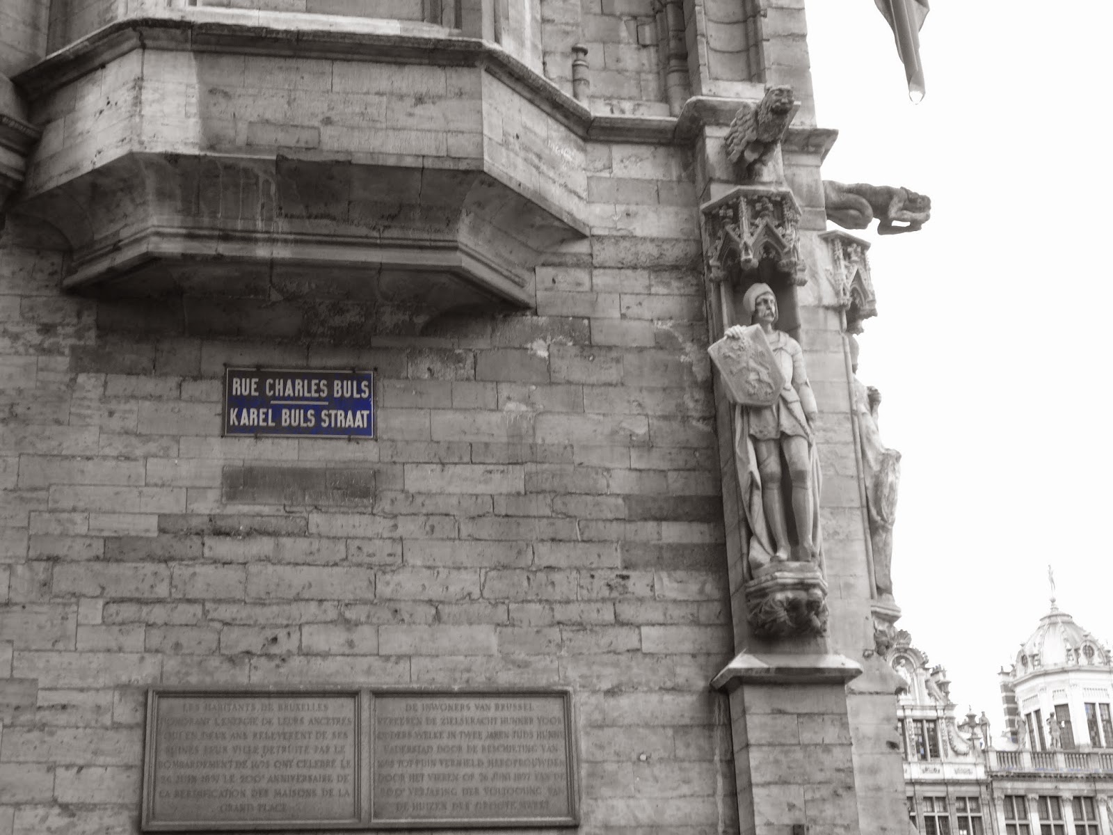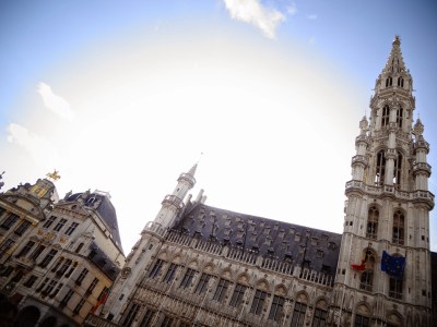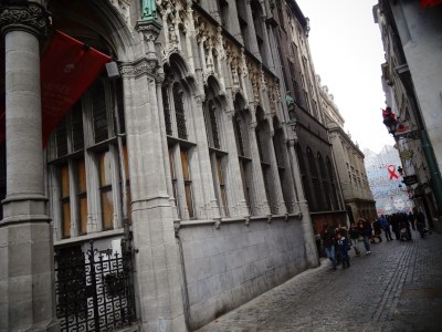 一不小心就會走到布魯塞爾的舊市鎮廳大廣場,最高聳的鐘塔就是舊市鎮廳的鐘塔,它的對面是國王之家,旁邊是金碧輝煌的旅館和餐廳,建築物的主體都有用一些鍍金去雕刻。