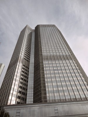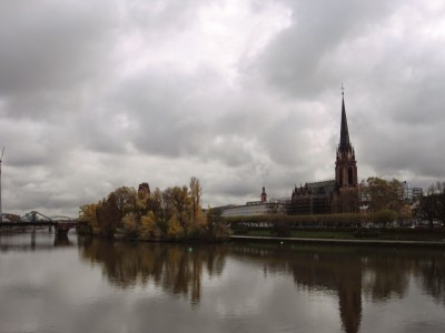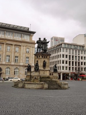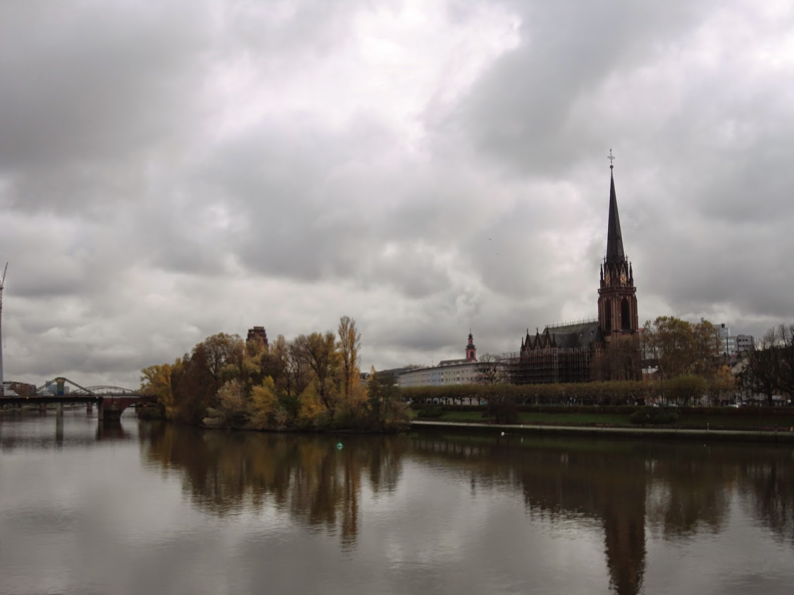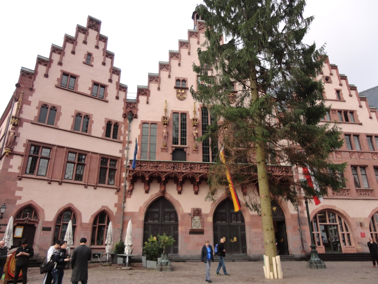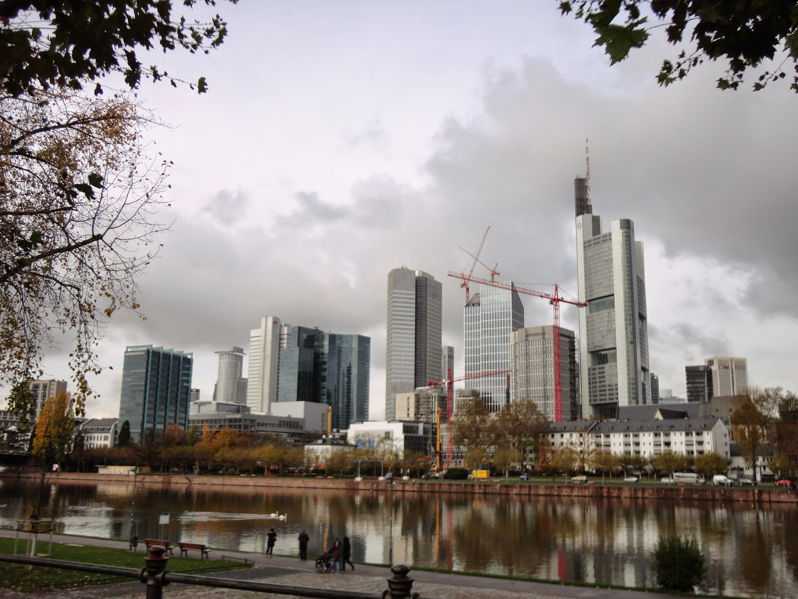 在火車站等了James和竹君以及一起在曼漢(Mannheim)交換的同學,今天與他們來個法蘭克福半日遊,法蘭克福在二戰的時候也是全部都被炸得可以,所以看到的都是現代的大樓。順著火車站前的路走,兩旁都是高聳的大樓,遠處看到草坪上有一個大大的歐元符號,那棟就是歐元大樓,