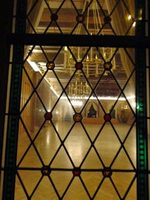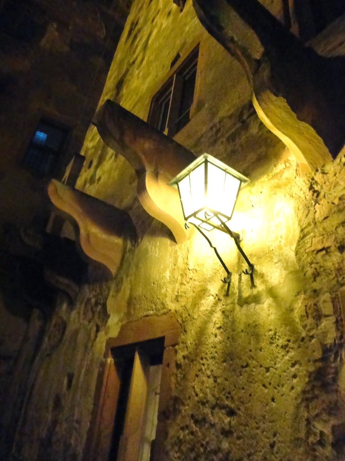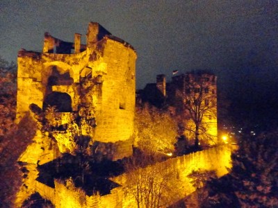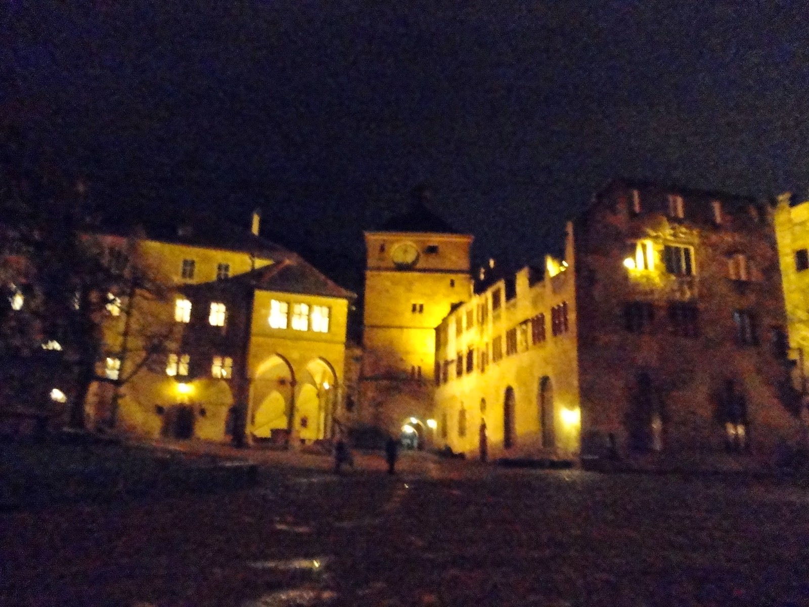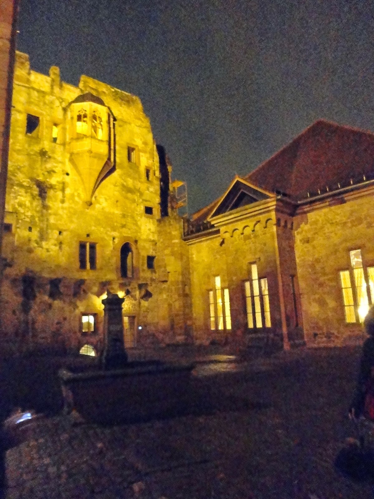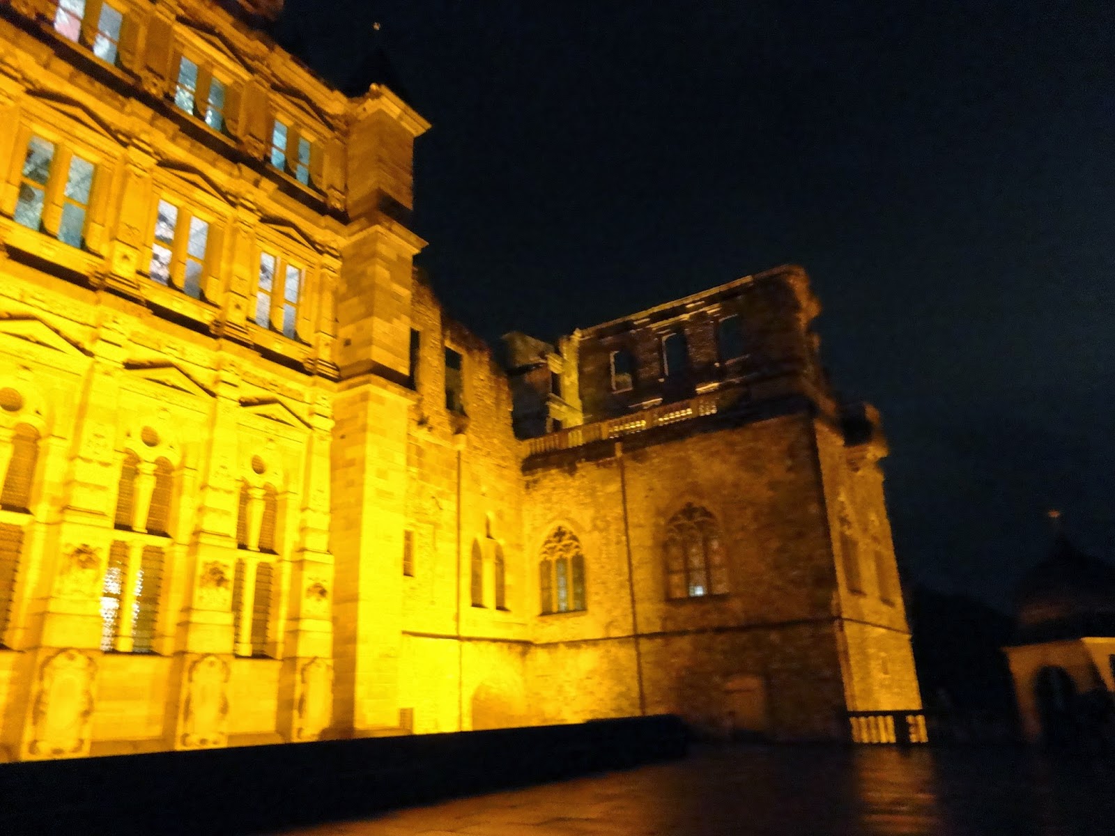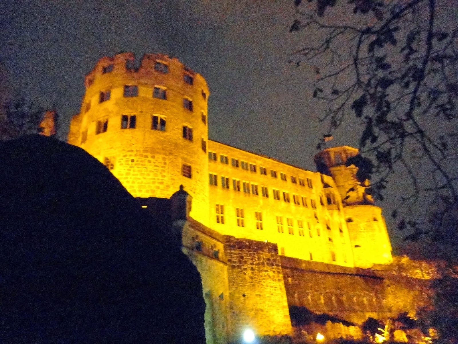 走到城堡旁發現入口竟然是打開的,晚上可以讓人自由進去參觀,於是就像城堡主人邀我們來享用晚餐般,浩浩蕩蕩地走進城堡裡,城堡的牆面都被地上的燈光打成黃色,使我們陶醉在這座夢幻的城堡中。
