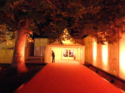 走到底來到了纜車站,用邦票可以坐上去不用在買票,隨著纜車的高升,漸漸看到整座小鎮的夜景,一出站就可以看到打著黃光的城堡,旁邊的公園正好搭起了帳篷在辦電影節,