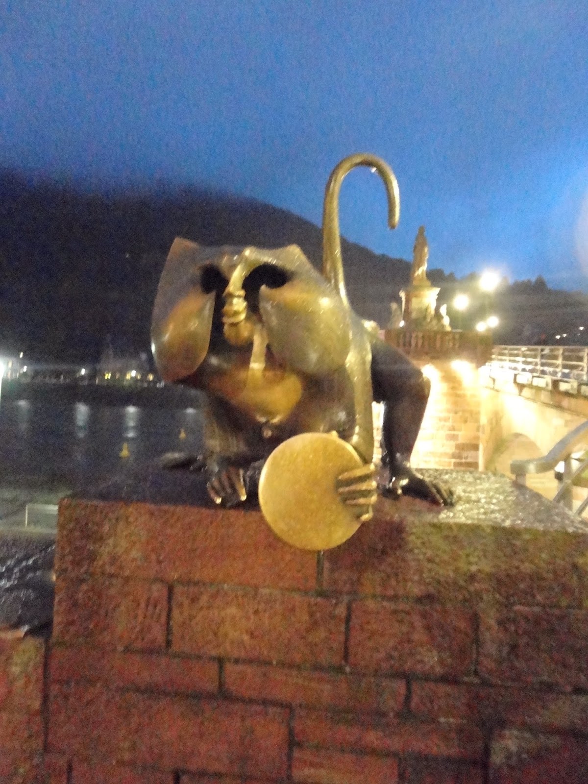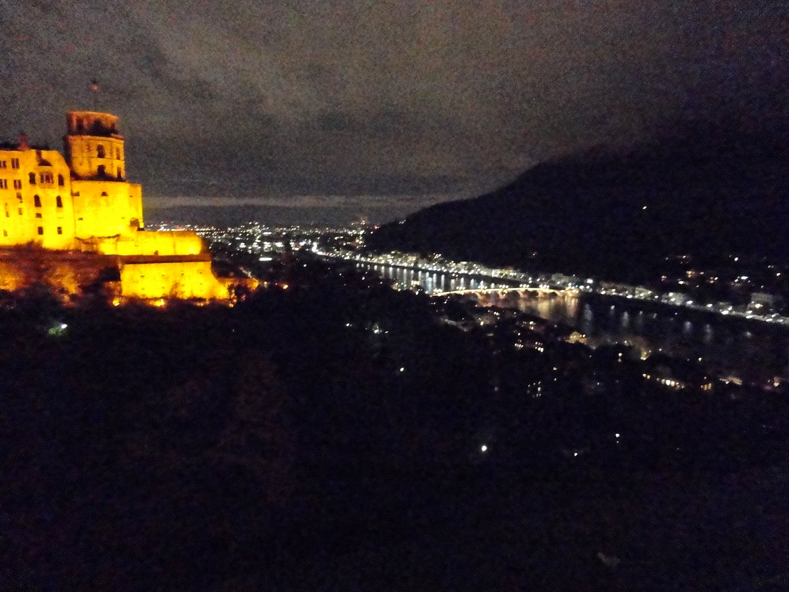 假文青一下發現都是一些看不懂的電影,只好出來走到了公園上的平台,看著山下的河流被沿岸的燈光打亮,海德堡的老橋就跨坐在河上閃閃發光,
