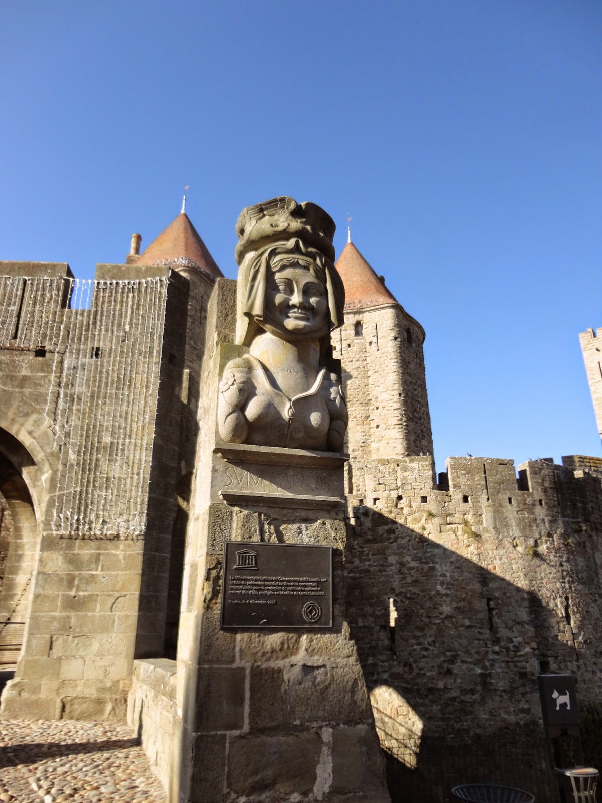 下了飛機,不用擔心接駁的問題,因為南法小機場通常都會有巴士算好飛機抵達的時間,在機場等乘客,比坐計程車到市區便宜喔。我們直接坐到巴士的最後一站卡爾卡頌舊城,整個舊城區就是一座大城堡,有外牆跟內牆保護,一到門口有一尊雕像,是卡卡夫人,傳說中她是在撒拉森人統治卡爾卡頌時,想出妙計,擊退來攻打的法蘭克國王查理曼大帝。卡爾卡頌最早由羅馬人建城,歷經西哥德人與撒拉森人,最後歸回法蘭西王國,歷經風雨,也曾差點被拿破崙三世強迫拆除,經過修補呈現在完整的風貌。