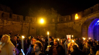 我們沿著內外牆間走了一圈,走回前門時,遊行的隊伍已經差不多集結完畢,大家拿著火把,先由有穿傳統衣服的先走,最後才是我們亂入的跟在後面。
