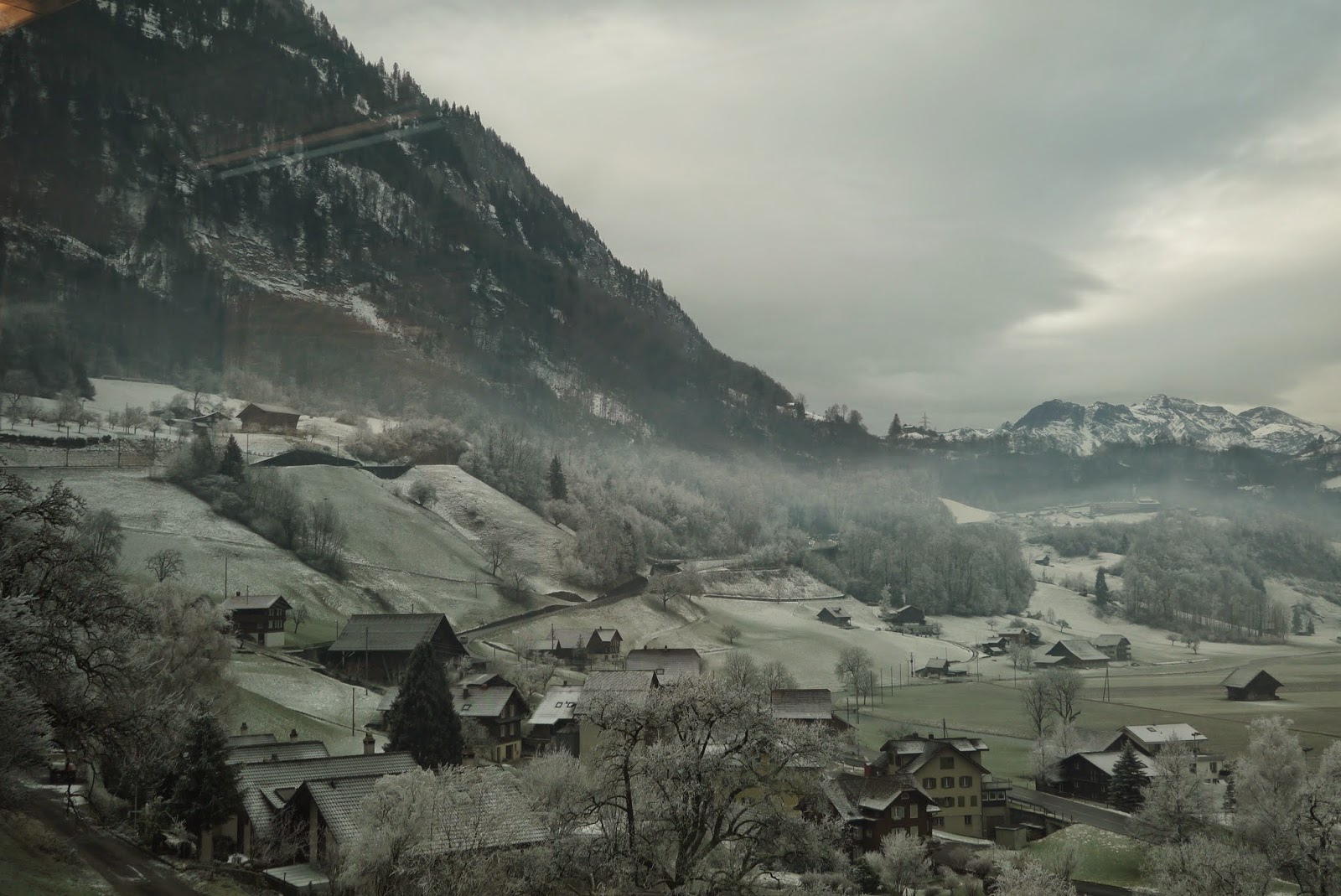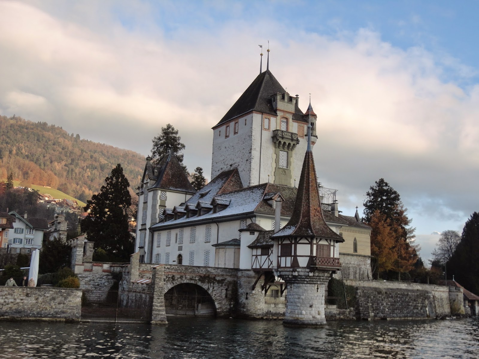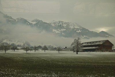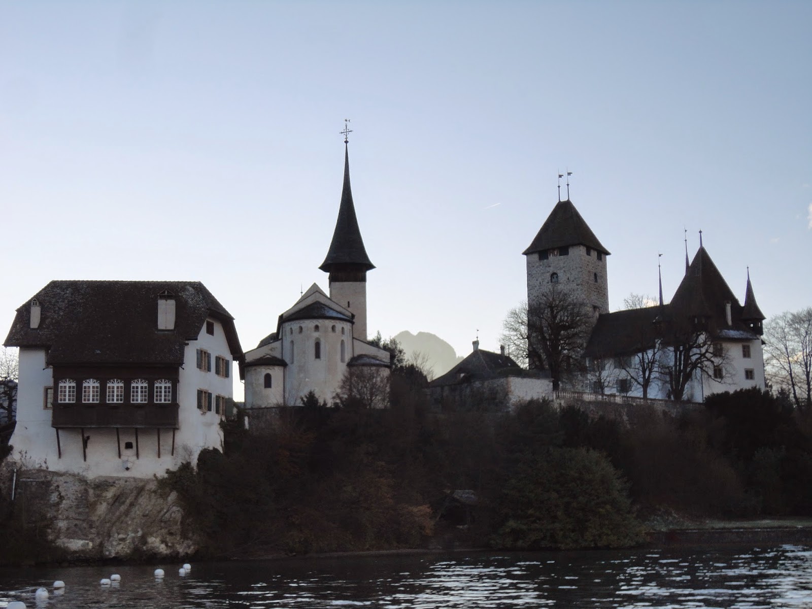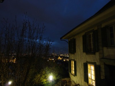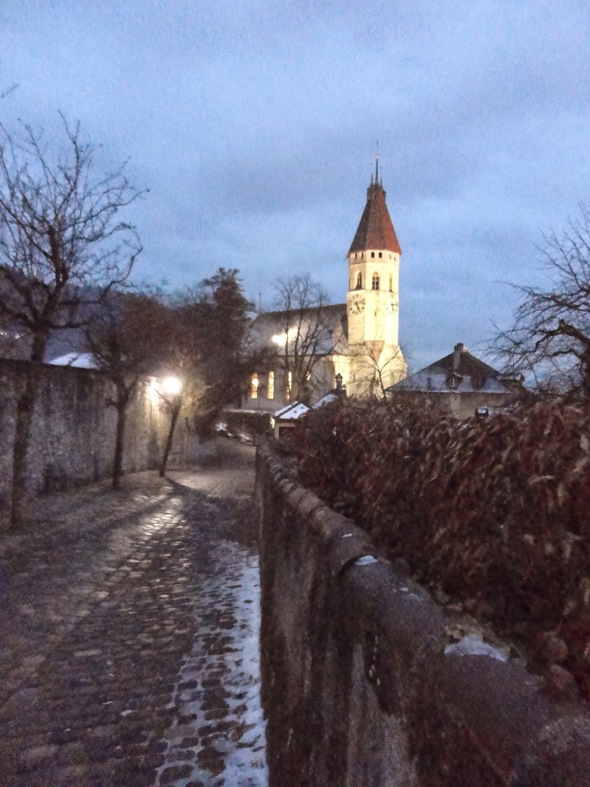 沿著兩旁復古的路燈透著寒意,經過教堂慢慢走下山,搭火車回Interlaken, 搭回來的路上都快睡著了,原來下午顧著看美景都忘記注意船有開這麼遠,回到飯店,跟飯店的老闆借了餐具在小餐廳用餐,剛好遇到了從香港來的朋友,小聊了一下後,帶著倦意會到房間。