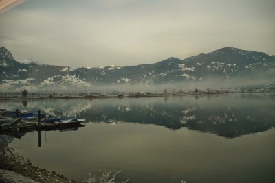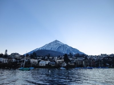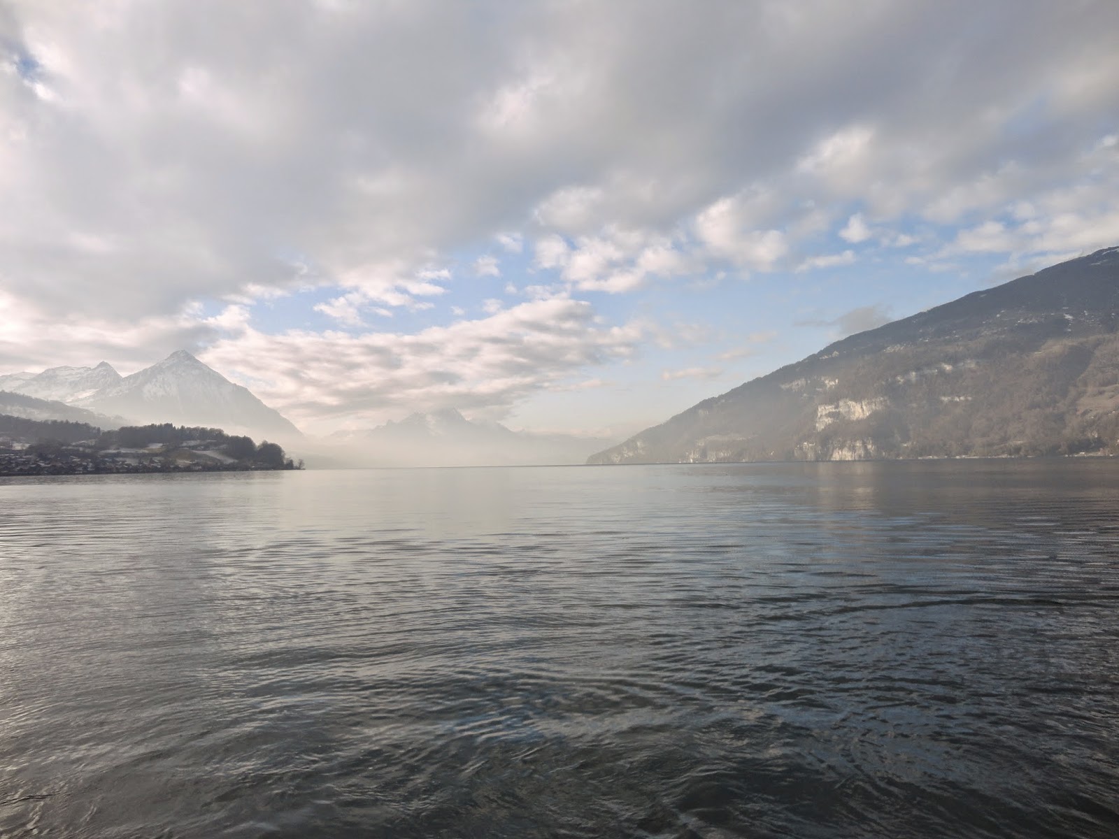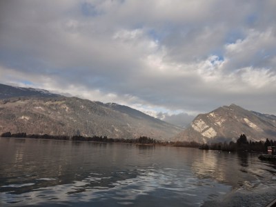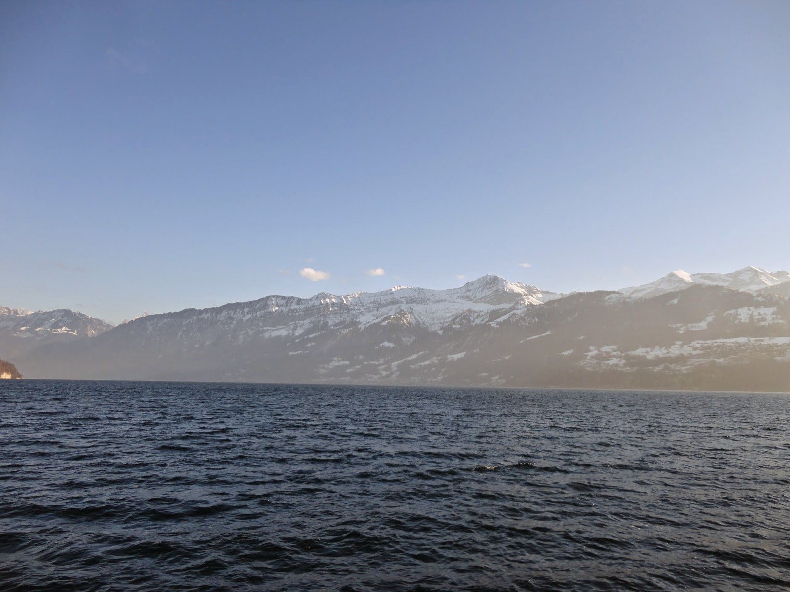 往回看遠方的阿爾卑斯山群上的白雪被太陽照成了金黃色,船會在湖的左右岸的港口間行進,成S型的方式慢慢開到Thun(土恩),
