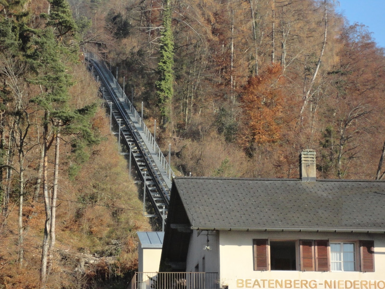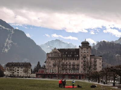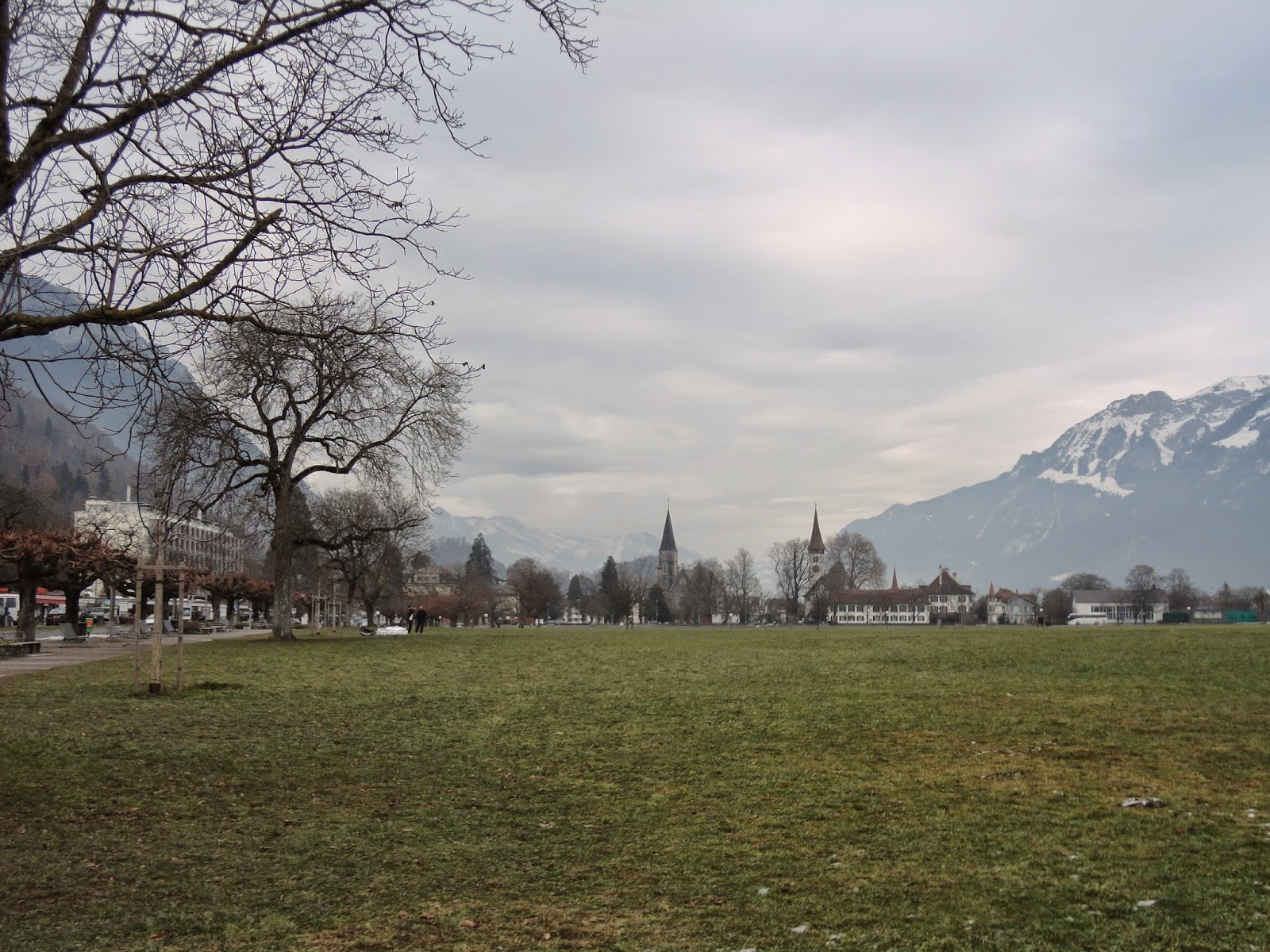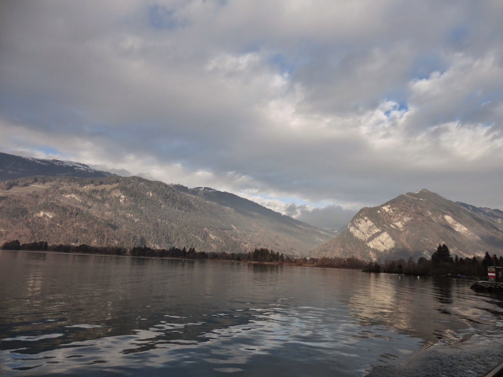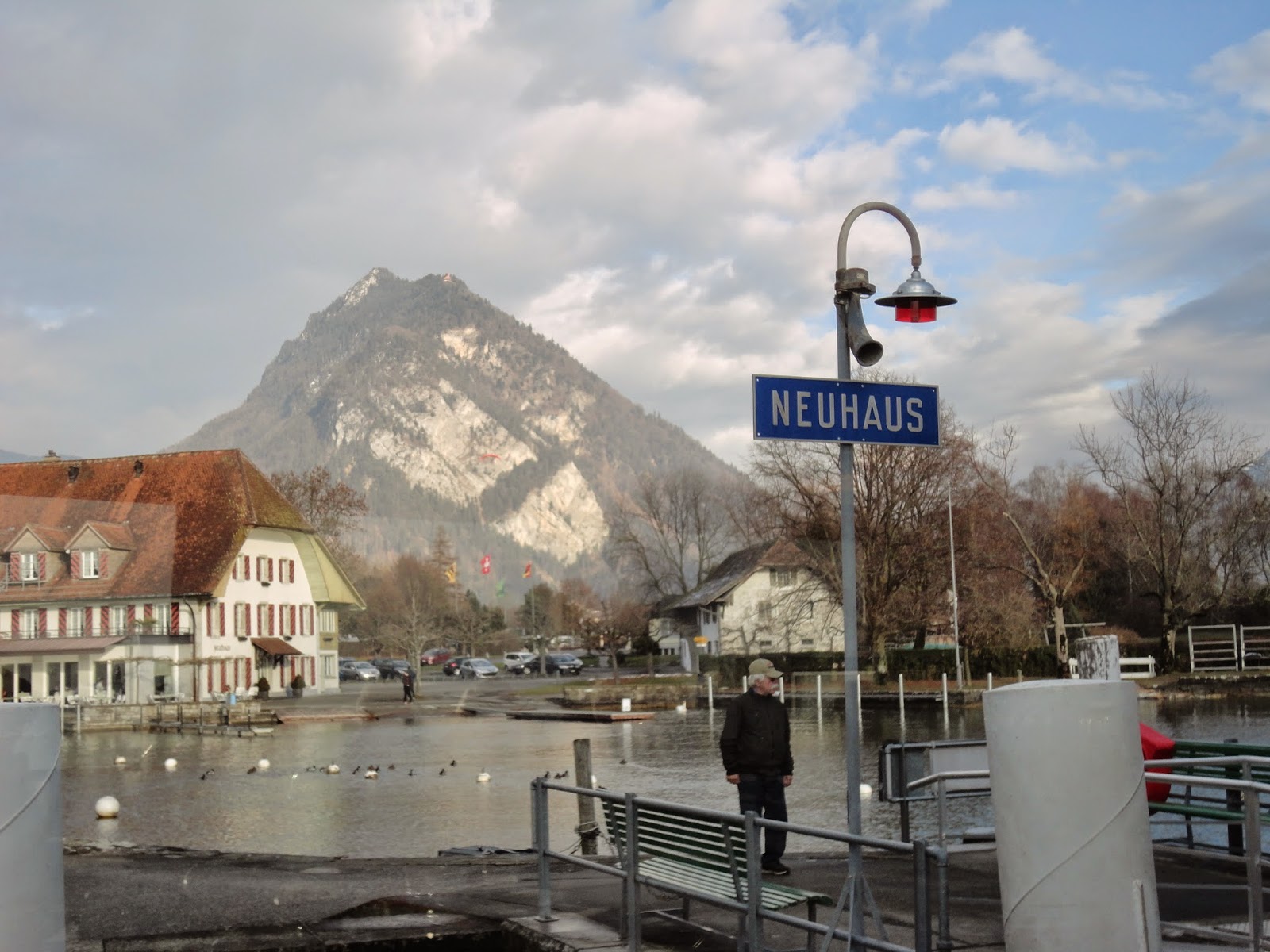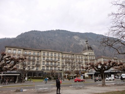 Interlaken顧名思義就是在兩座湖中間的小鎮,一座是從東邊來會經過的Brienz湖,一座是等下要坐船遊湖的Thun湖,先做到Interlaken東站,這裡跟西站比比較沒這麼熱鬧,但是如果要上少女峰的話要在這裡轉車,這趟旅程因為時間的關係就沒上少女峰了,在與竹君他們分開後,先走到西站,經過一的大草坪,有人玩高空跳傘會降落在這裡,路上則是一堆賣精品手表的店,因為是淡季的關係,遊湖只剩下午2點多的時段,要趕著搭上船,趕快先去飯店check-in後就直奔碼頭,穿過火車站地下道到底就會看到碼頭。