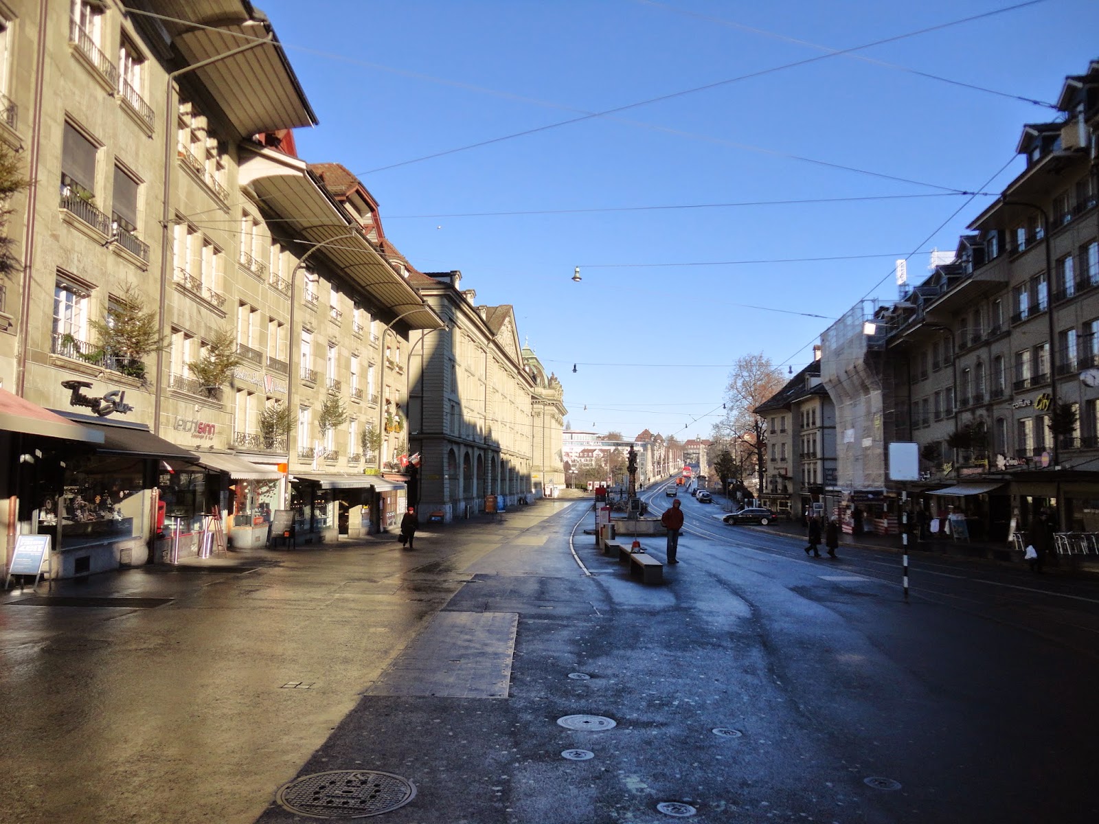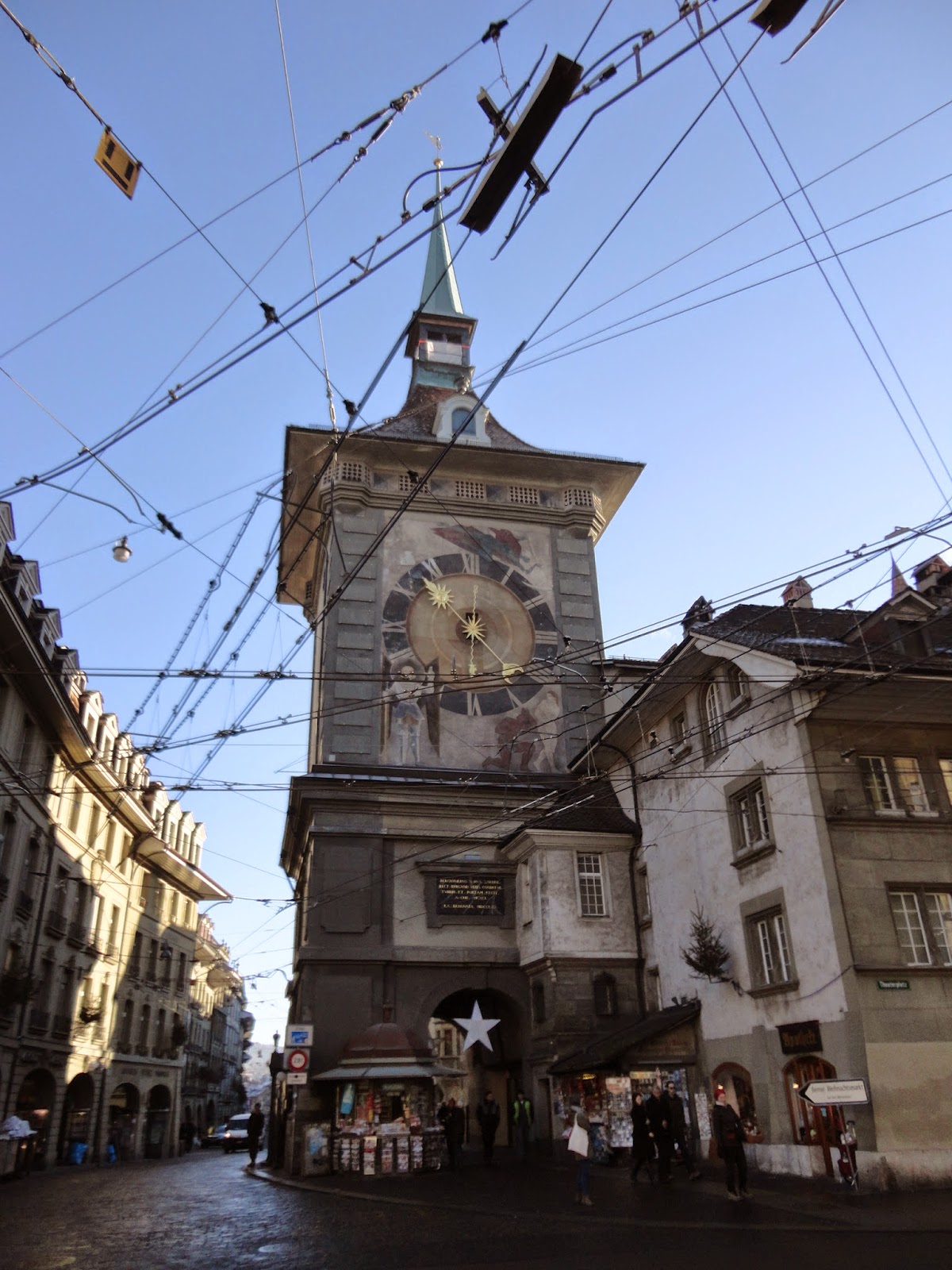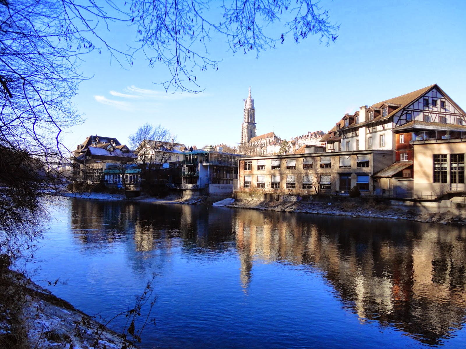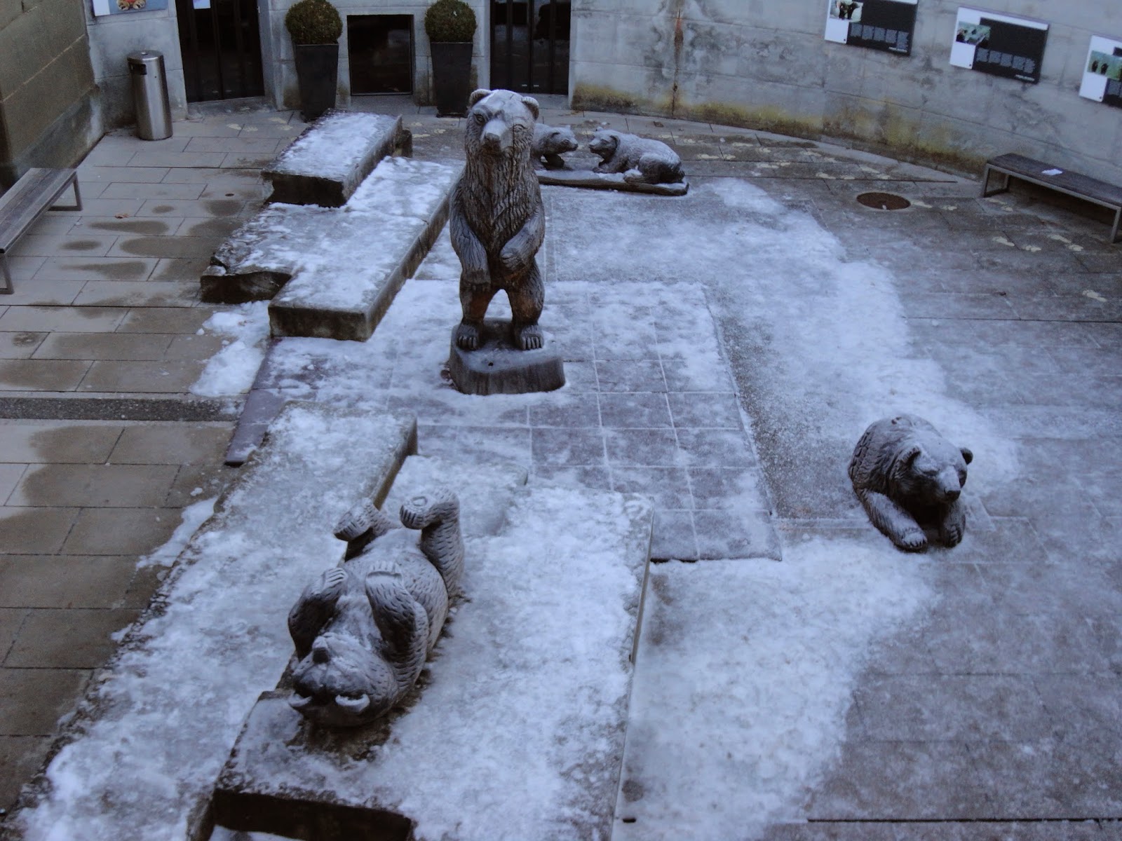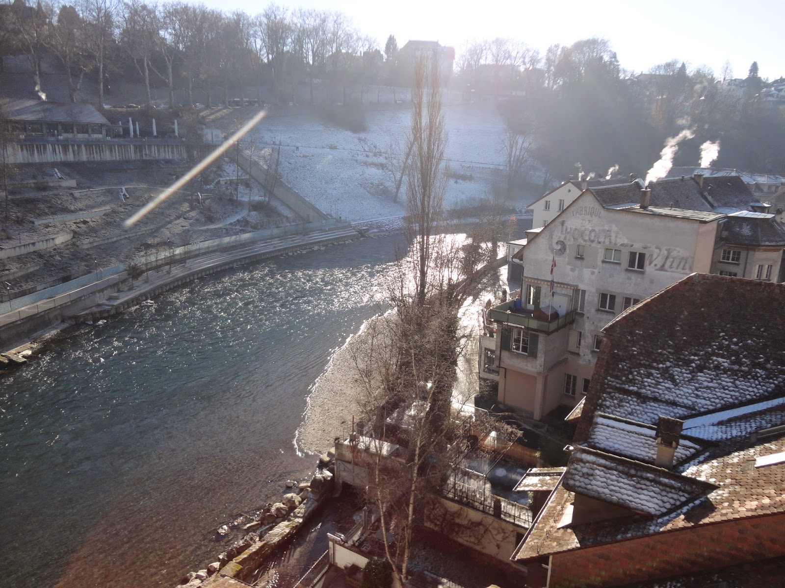 突然到了橋頭,感受到了陽光的溫暖,原來剛剛太陽還沒升的這麼高,整座街道都還在房子的陰影下未甦醒,Bern剛好是被一座河流成Ω型流過,就像捷克的CK一樣,只是裡面的城市高度更高,看起來更有護城河的感覺,用許多橋梁連接著外圍,橋梁的下面有一座養熊的圈子,Bern的市徽就是一座熊來代表,只可惜熊都去冬眠去了,只剩雕像被白雪覆蓋在寒冷的冬天裡暴露著。