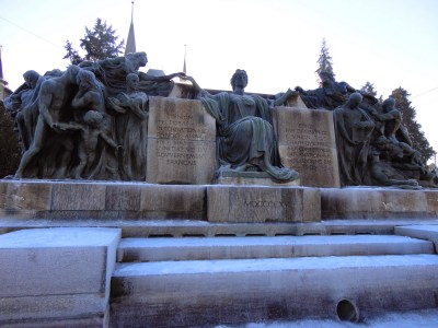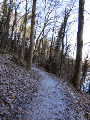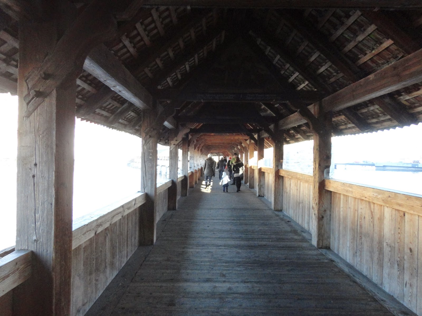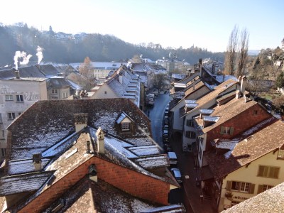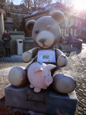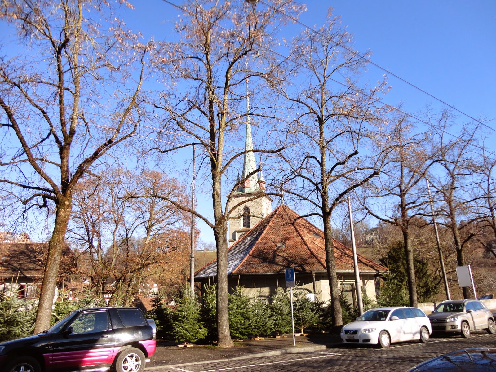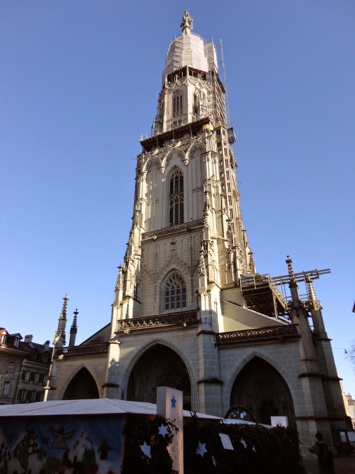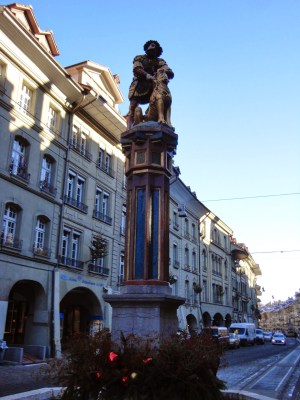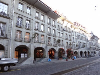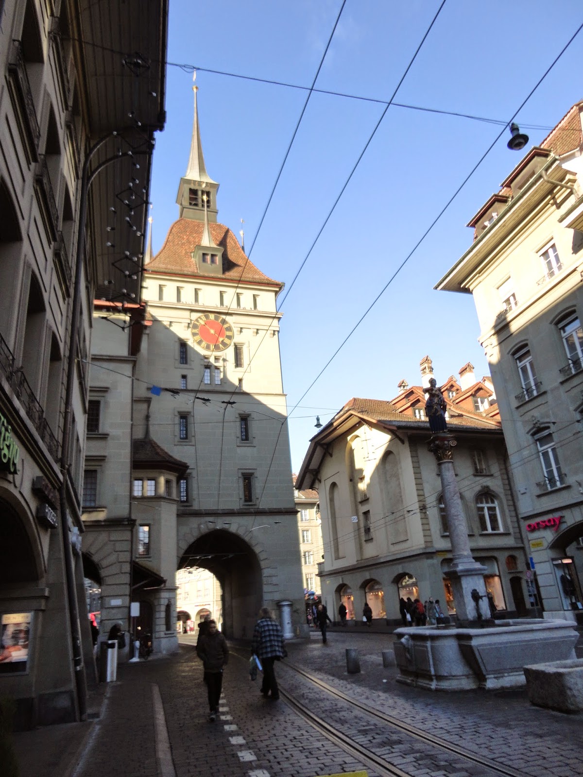 突然到了橋頭,感受到了陽光的溫暖,原來剛剛太陽還沒升的這麼高,整座街道都還在房子的陰影下未甦醒,Bern剛好是被一座河流成Ω型流過,就像捷克的CK一樣,只是裡面的城市高度更高,看起來更有護城河的感覺,用許多橋梁連接著外圍,橋梁的下面有一座養熊的圈子,Bern的市徽就是一座熊來代表,只可惜熊都去冬眠去了,只剩雕像被白雪覆蓋在寒冷的冬天裡暴露著。