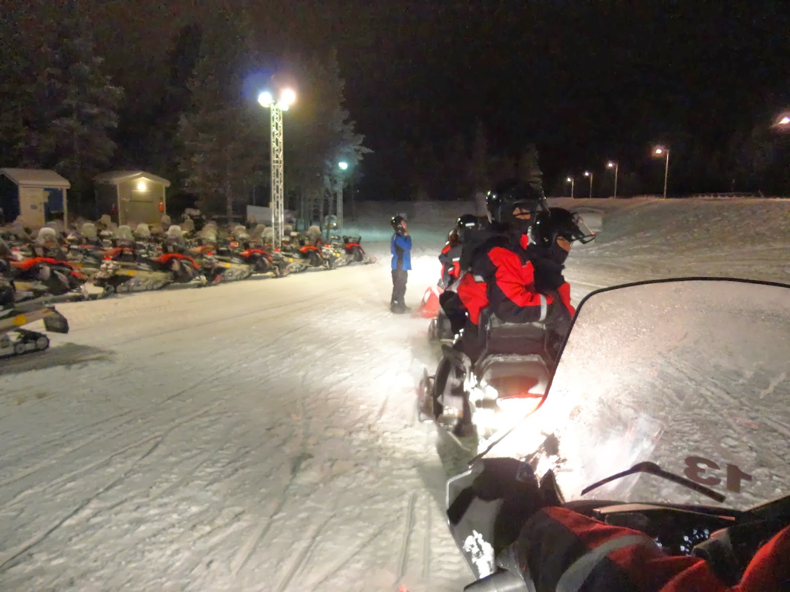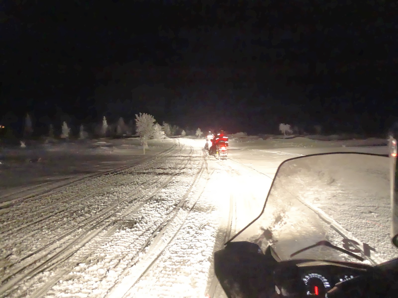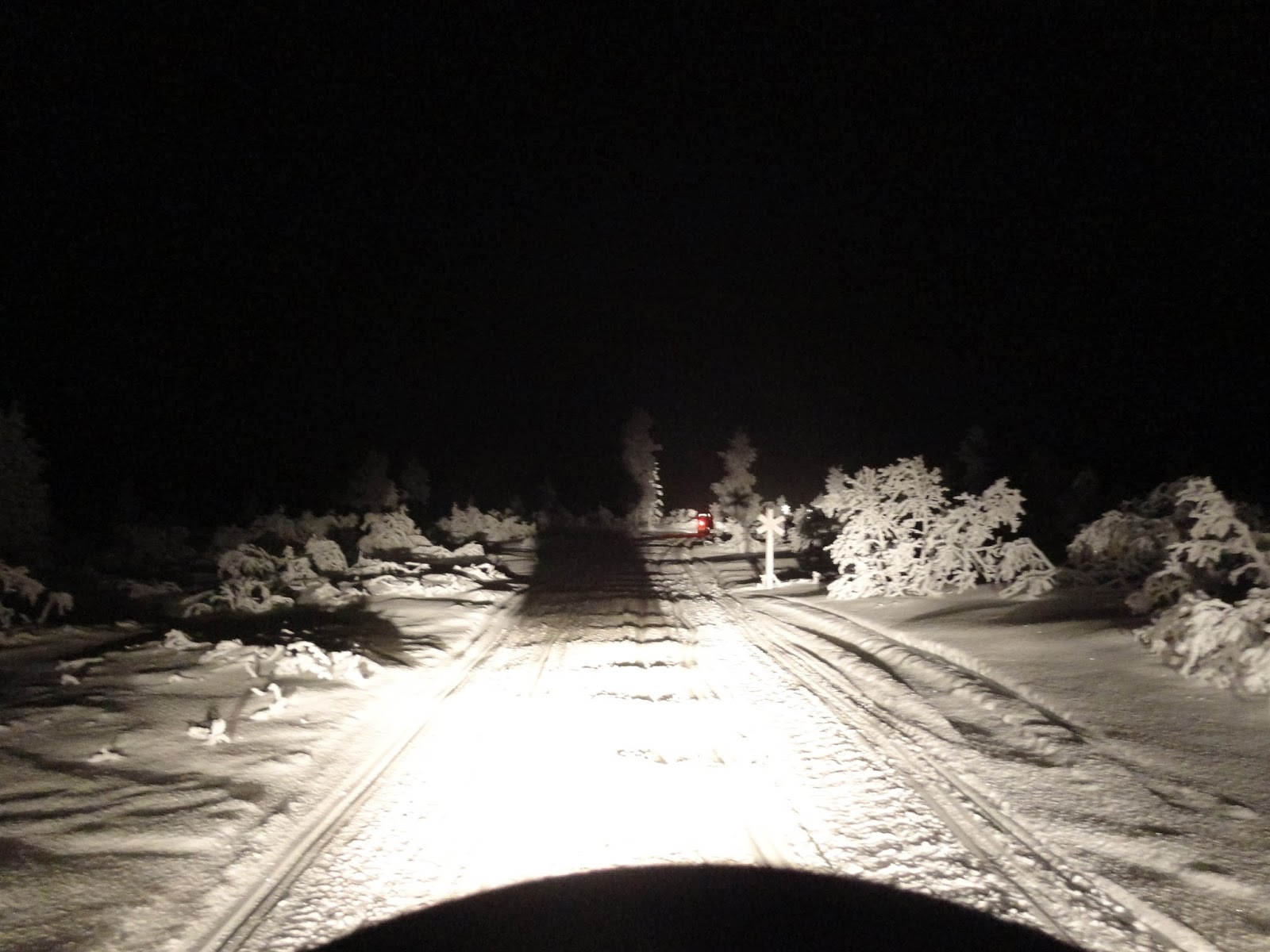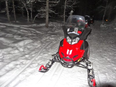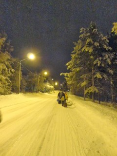 因為沒有極光行程,經過大家討論後,決定晚餐後去騎雪上摩托車,有點小貴,一個人大約是78歐兩個小時。騎雪上摩托車一開始要先換上連身保暖衣,很像昨天火車上看到那兩個小女孩穿的衣服,兩個人騎一台摩托車,由教練帶頭,一群人騎往黑漆漆的森林裡,整個森林感覺只有我們一群人,雪覆滿樹木,路標都被雪覆蓋,就像一個死寂的森林,看著照後鏡一片黑,只好乖乖的跟緊前面的夥伴。