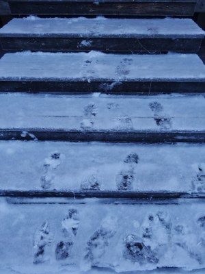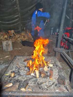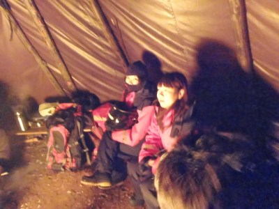 大約騎了三十分鐘,我們到達了森林裡的營地,原本這個行程是要搭配看極光的,所以才會跑到深處沒有光害的地方,可惜天空不做美,我們只能待在森林裡的帳篷裡取暖烤熱狗。營地的帳篷裡各式各樣的道具都有,熟練的教練開始生火,並把行囊裡的食物拿出來烤給大家吃,聊天之中才知道原來他比我們年紀還小,他只是聖誕假期來打工的,但問他為什麼這麼熟悉這裡以及生火的技巧,他說他在當地長大,也就是所謂的Lapland人。