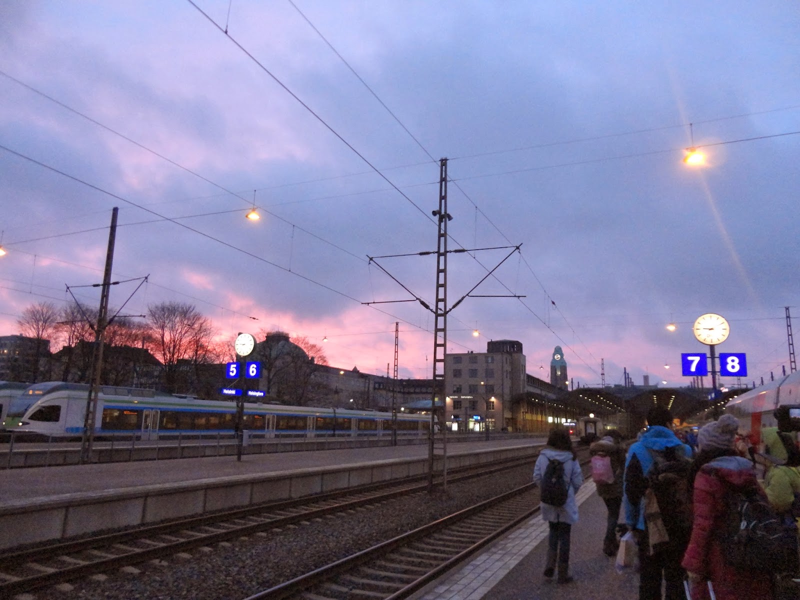 睡了一覺的夜鋪火車,平安夜的這天,我們來到了赫爾辛基,在火車搖搖晃晃的加持下,一下子就睡著了。一起床想吃個早餐,一直以為是09:25分到赫爾辛基火車站,但是快九點就到站了,匆匆忙忙地把行李收好下車。很喜歡早起的天空,因為緯度很高,所以才剛天亮。