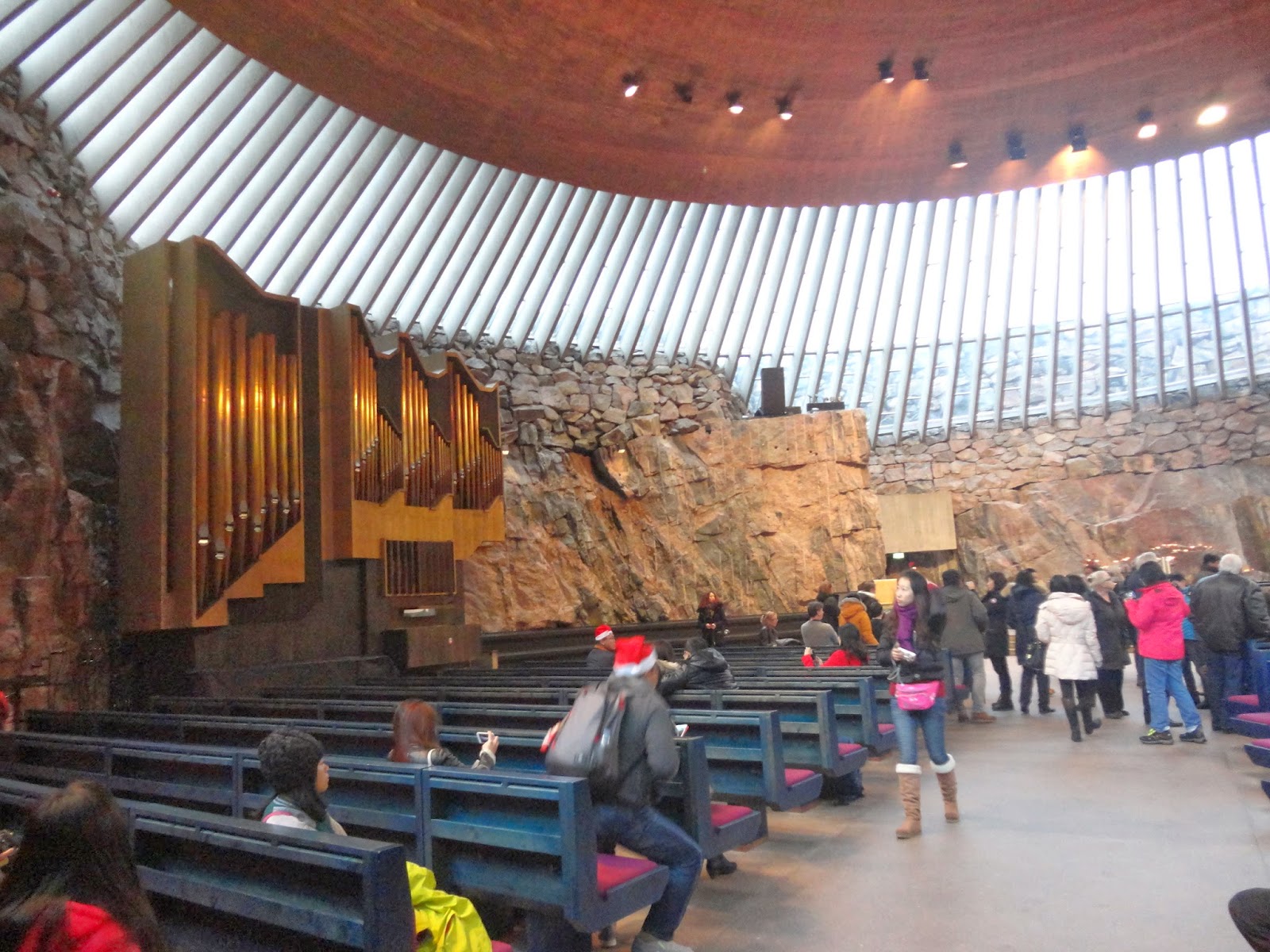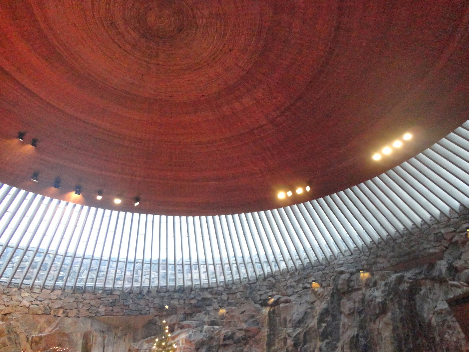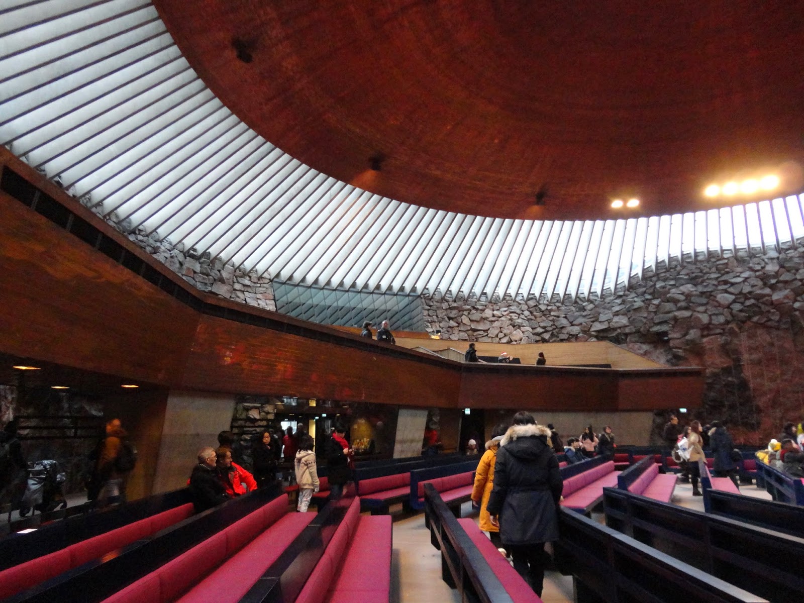 西貝流士最有名的歌曲就是芬蘭頌,這首歌是在芬蘭被俄羅斯統治下所創作出來的,整個曲子氣勢磅礡,喚起了整個芬蘭的民族意識,幾乎成為了當時的國歌。短暫的停留後,我們沿著原路走回到岩石教堂。岩石教堂的外觀很特別,是一個圓形的教堂,從教堂的後面可以沿著坡道走到教堂的屋頂,整個教堂是用原本所在的大岩石向下挖,建成的教堂。