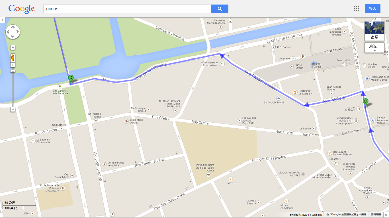 Quai de la Fontaine是Nimes噴泉花園大門前面的一條河,河水很乾淨